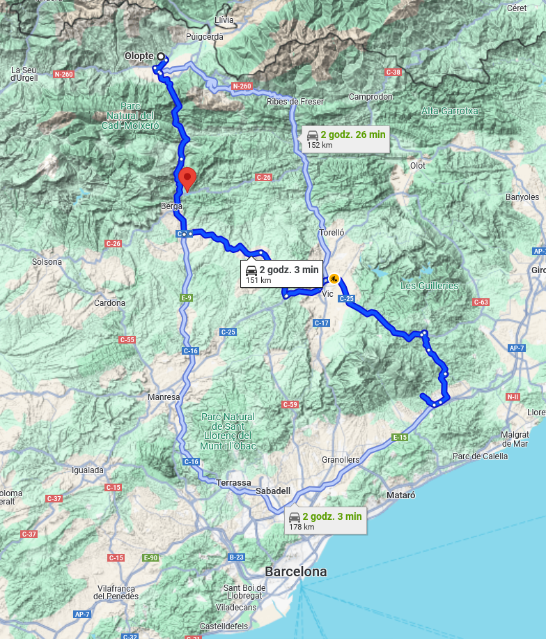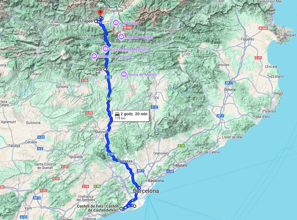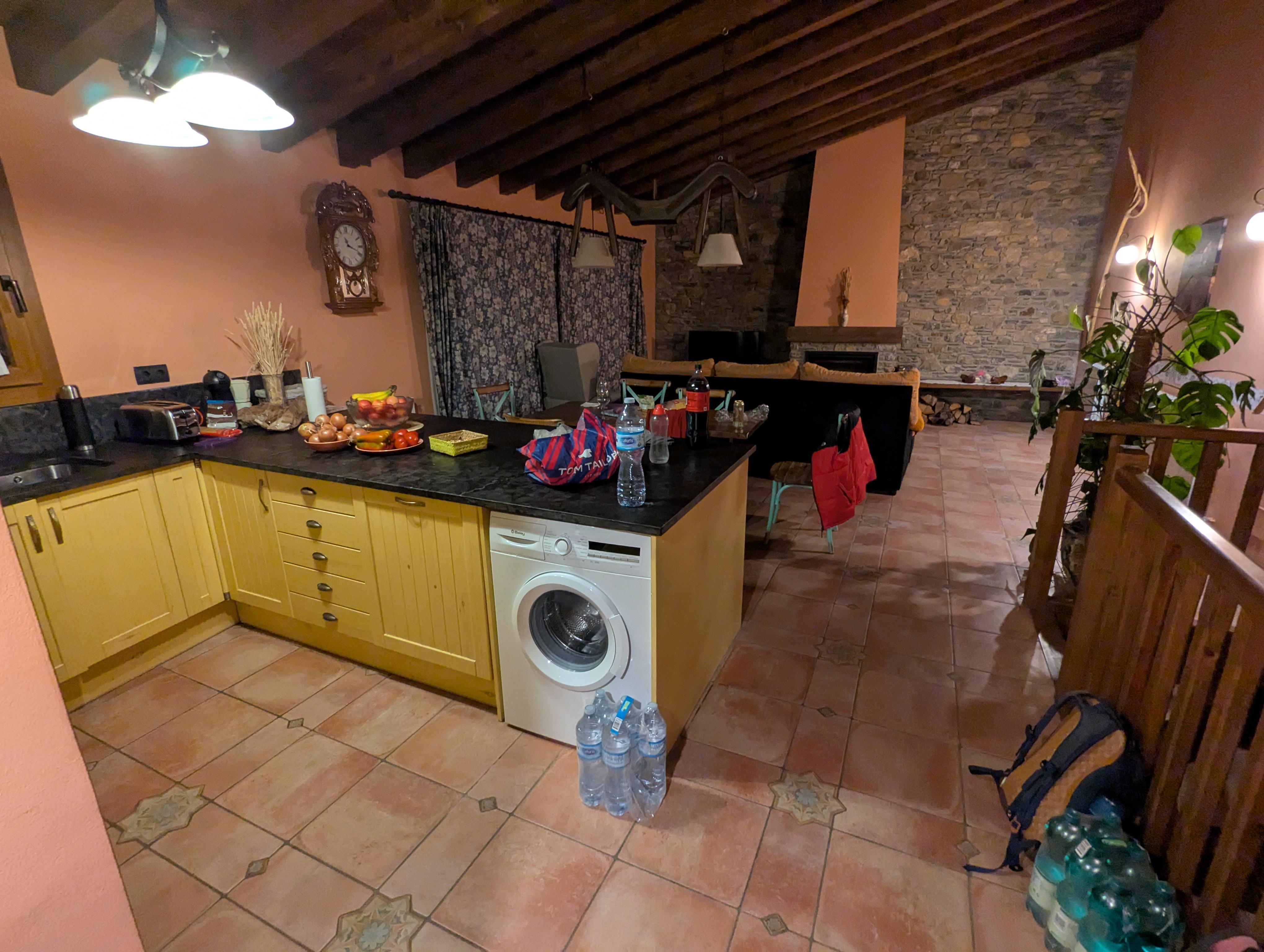 Później udaliśmy się w kierunku docelowym. Zatrzymaliśmy się jeszcze po drodze w Lidl’u w Berga i zboczyliśmy do Bellver de Cerdanya, żeby zjeść tapasy. I ostatecznie dotarliśmy do posiadłości Cal Teler-Tula w Olopte. Cała trasa to raptem 175 km, a dotarliśmy na drugi koniec Katalonii, blisko granicy z Francją.