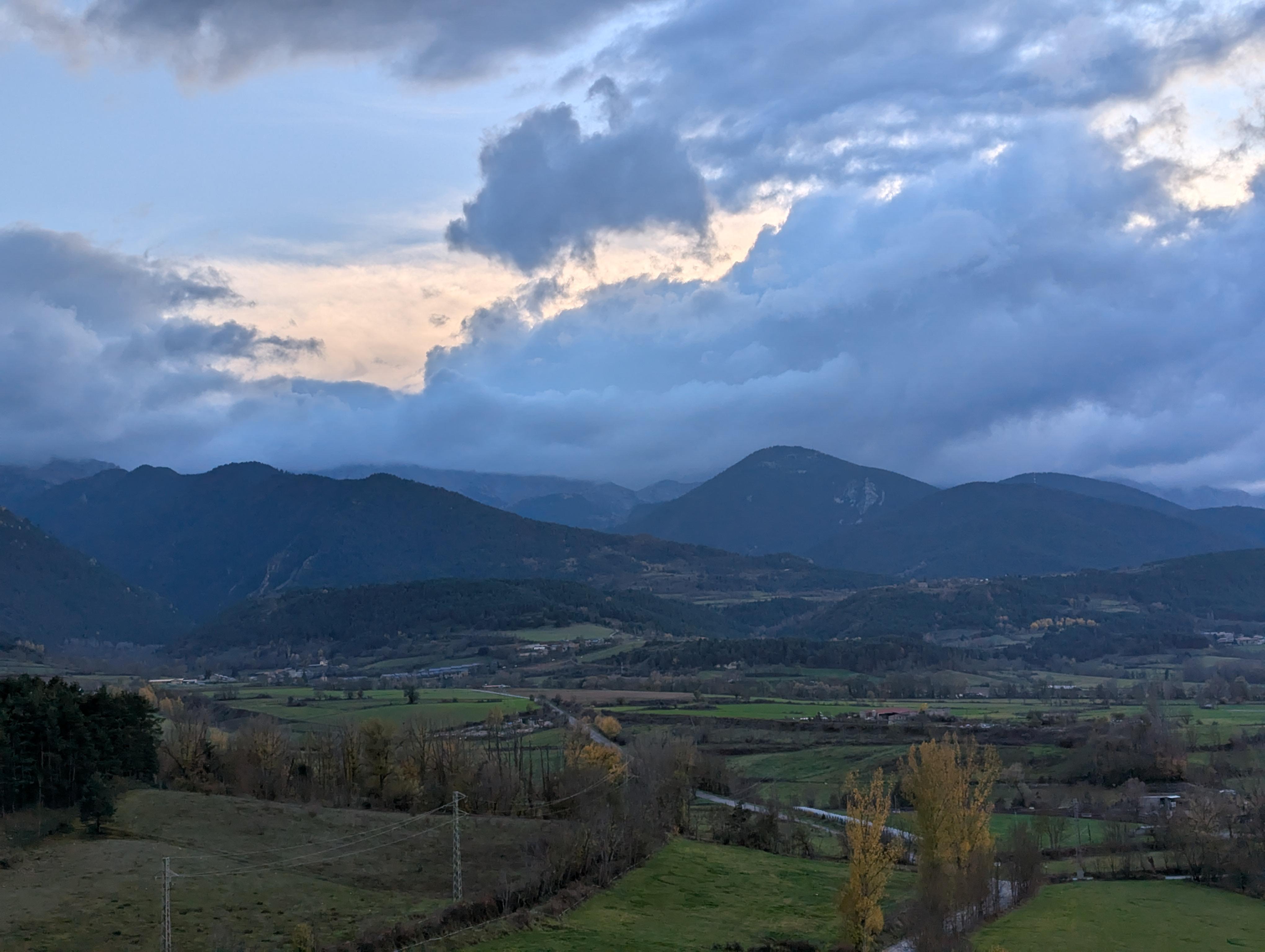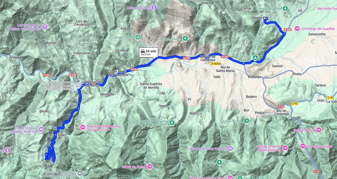 Pierwszy tydzień chcieliśmy spędzić w wyższych górach. Według google, polecanymi górami w Katalonii do wędrówek jest Parc Natural del Cadí-Moixeró. Zdjęcia wyglądały fajnie, jest dużo szlaków i dojazd niezbyt długi. Wybór noclegów nie był zbyt duży i raczej celowaliśmy w południową część gór, ale ostatecznie znaleźliśmy idealne miejsce po północnej stronie w Olopte. W gruncie rzeczy odległości nie są duże, więc zawsze można przejechać w inną część — przynajmniej tak myśleliśmy. Okazało się, że ta krótka odległość jest dzięki tunelowi pod Cadí-Moixeró, a przejazd kosztuje 14 euro w jedną stronę, więc trochę odechciało nam się jeździć na południe. A na około to godzina drogi.