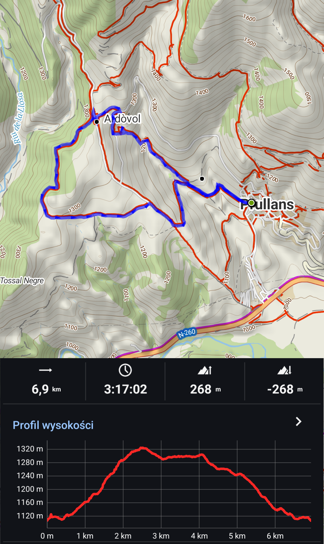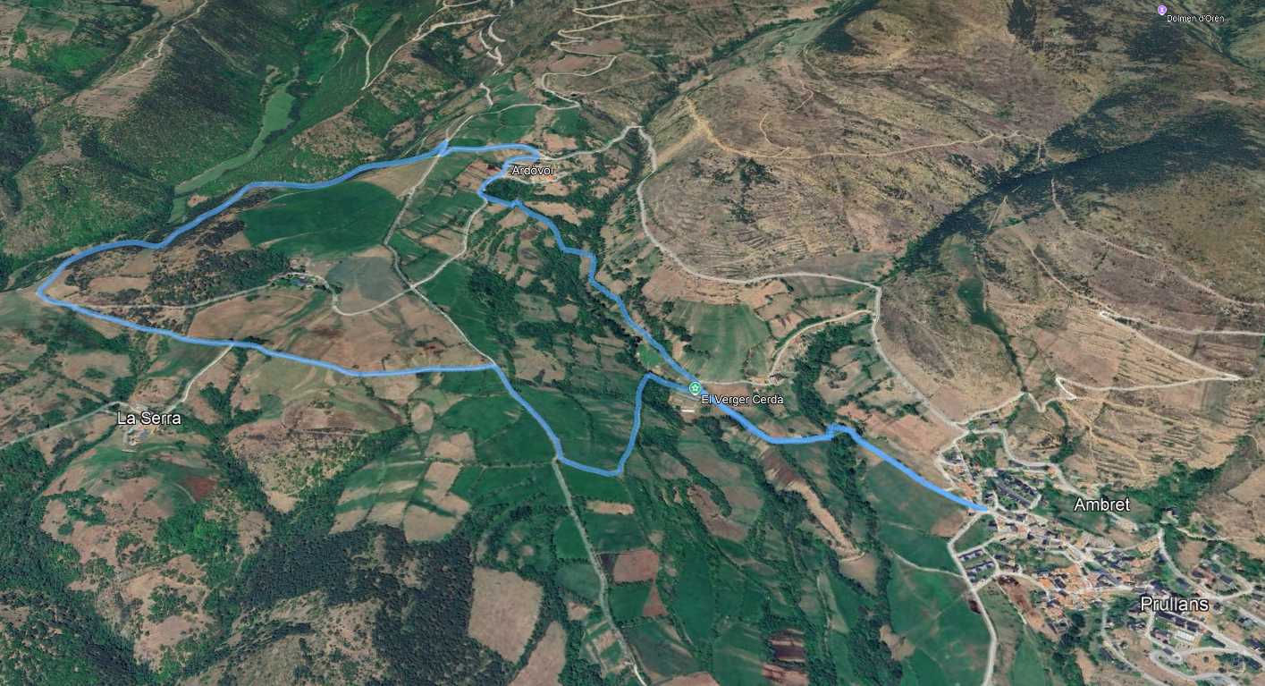 Tego dnia zrobiliśmy rozgrzewkową wycieczkę na 7 km i 270 m podejść. Zaczęliśmy z Prullans - małej, sympatycznej miejscowości. Ścieżka biegła ocienioną doliną, gdzie spotkaliśmy krowy. Przeszliśmy koło wyżej położonego Ardoval. Dalej było więcej słońca — zrobiliśmy zakole po drugiej stronie “grani” i wróciliśmy koło La Serra do Prullans.