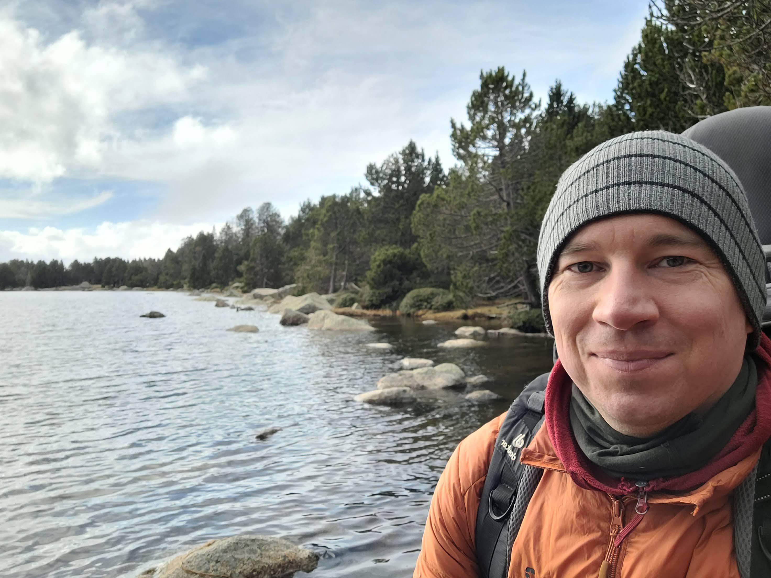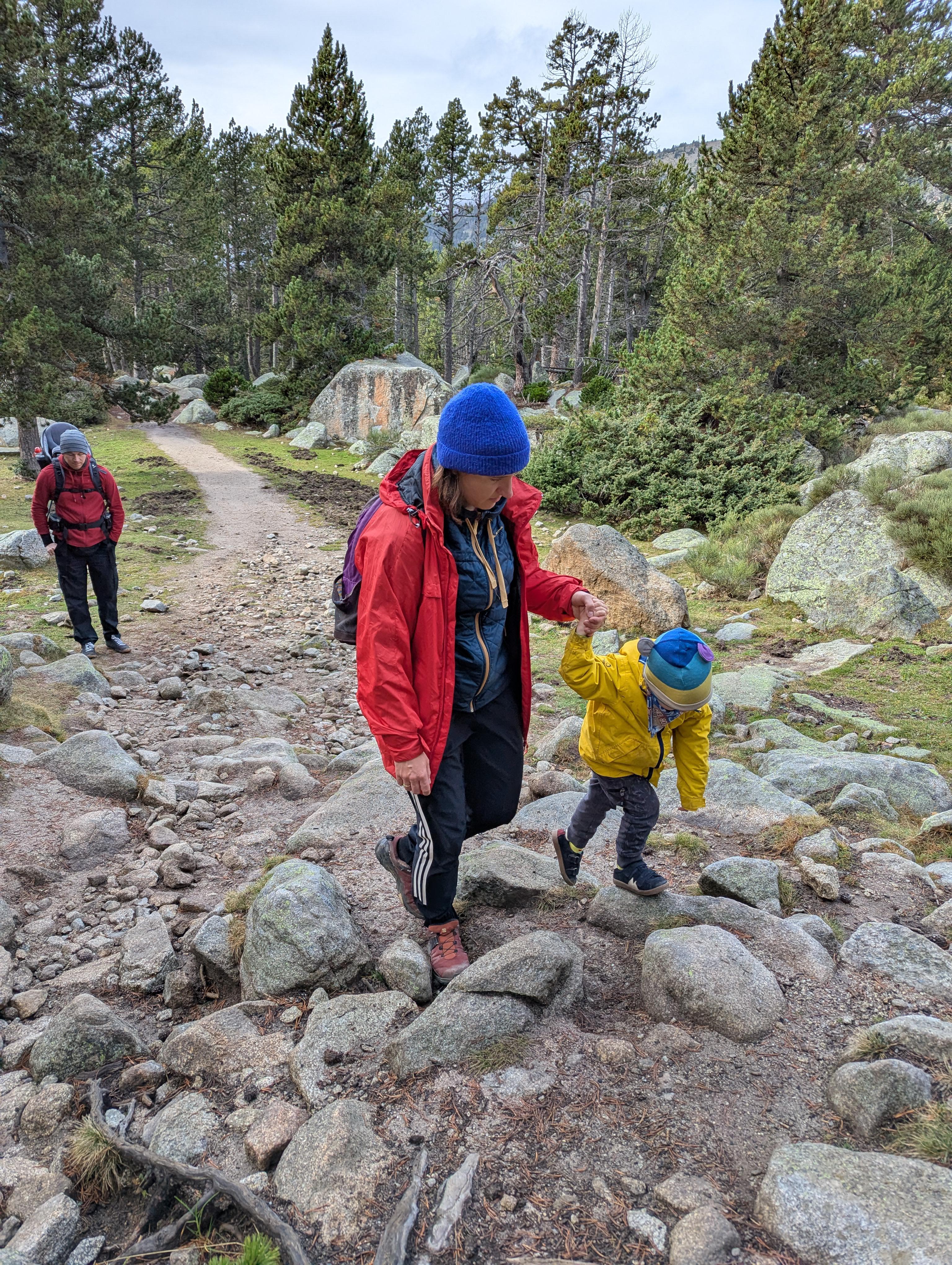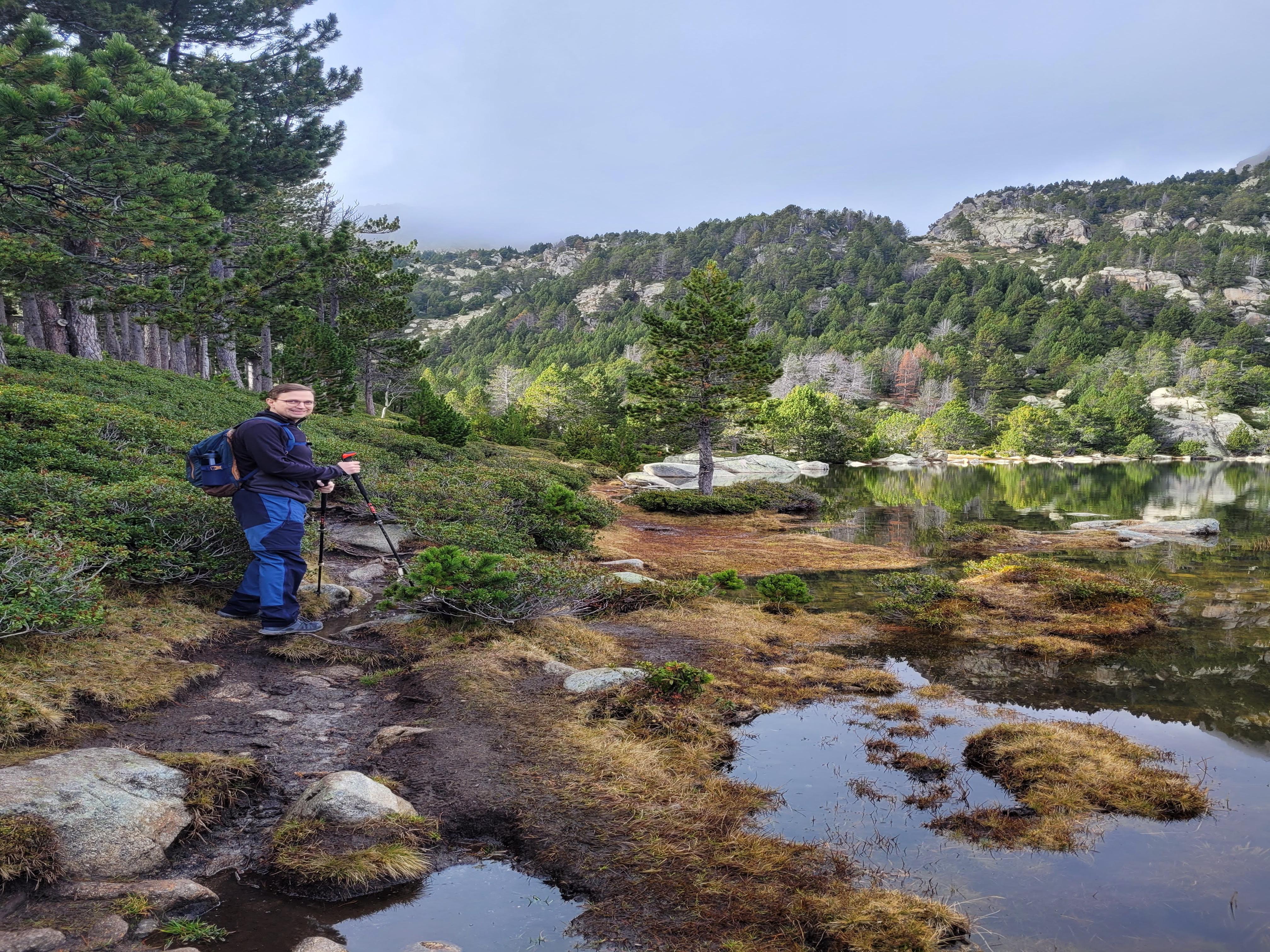 Postanowiliśmy nie iść do Estany Mal, ale rozdzieliliśmy się: Gosia z Kubą zaczęli schodzić, a Maciek i ja poszliśmy ścieżką wokół jeziora. Ścieżka to trochę dużo powiedziane. Teoretycznie było coś na mapie, ale w rzeczywistości nic oznaczonego i polegało to na przedzieraniu się przez krzaki, błoto i skakaniu po głazach.