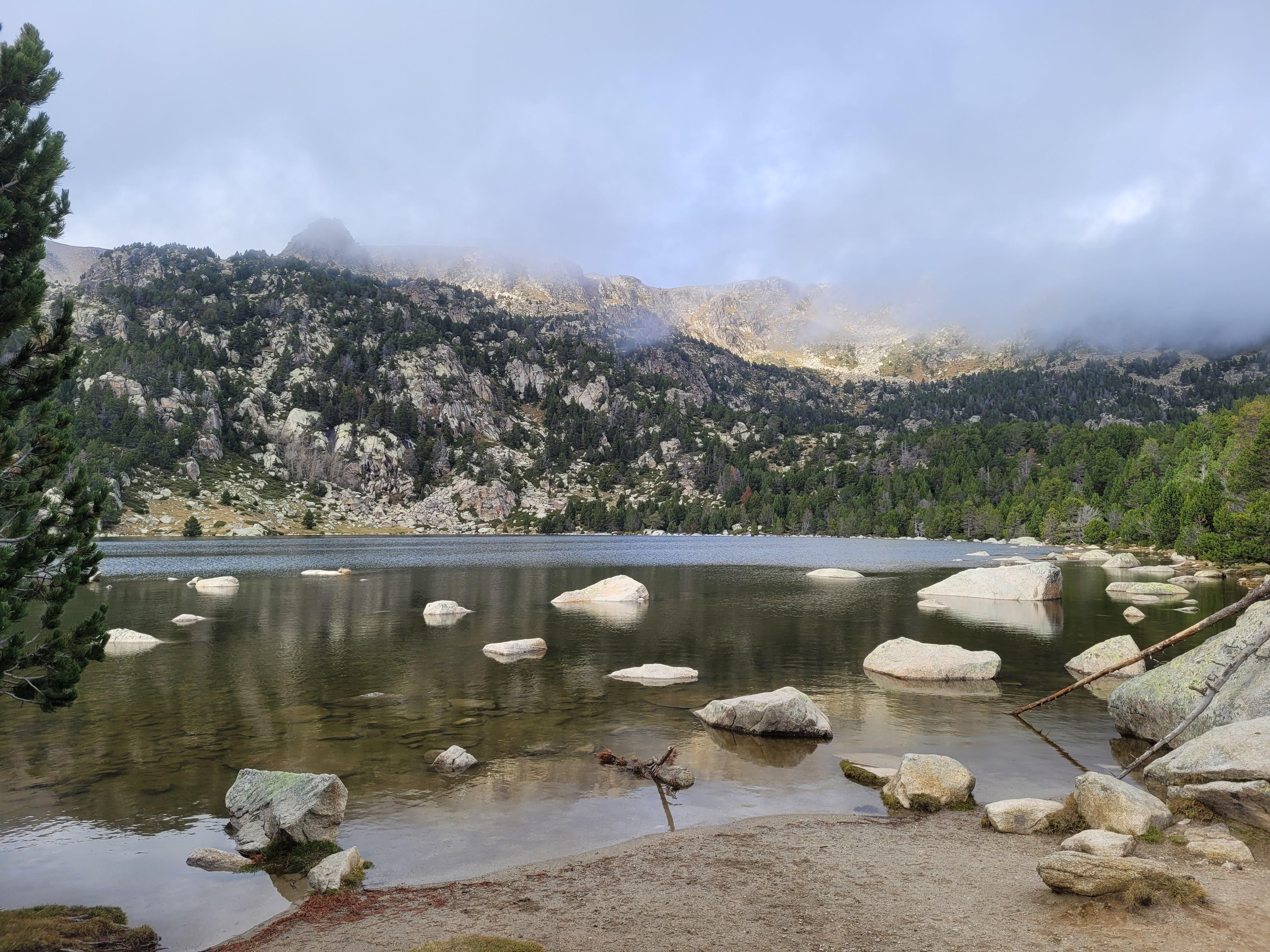 Od schroniska poszliśmy dalej bardzo przyjemną ścieżką, na której niesamowitą atrakcją było chodzenie po kamieniach. Spodziewalibyśmy się większych trudności na tych wysokościach. Weszliśmy 125 m wyżej i doszliśmy do Estany de Malniu (2250 m). Z jeziora można było zobaczyć pobliskie Roca de la Llosa (2366 m). Była również ścieżka na Puigpedrós (2915 m). Zrobiliśmy postój nad jeziorem i zjedliśmy prowiant.