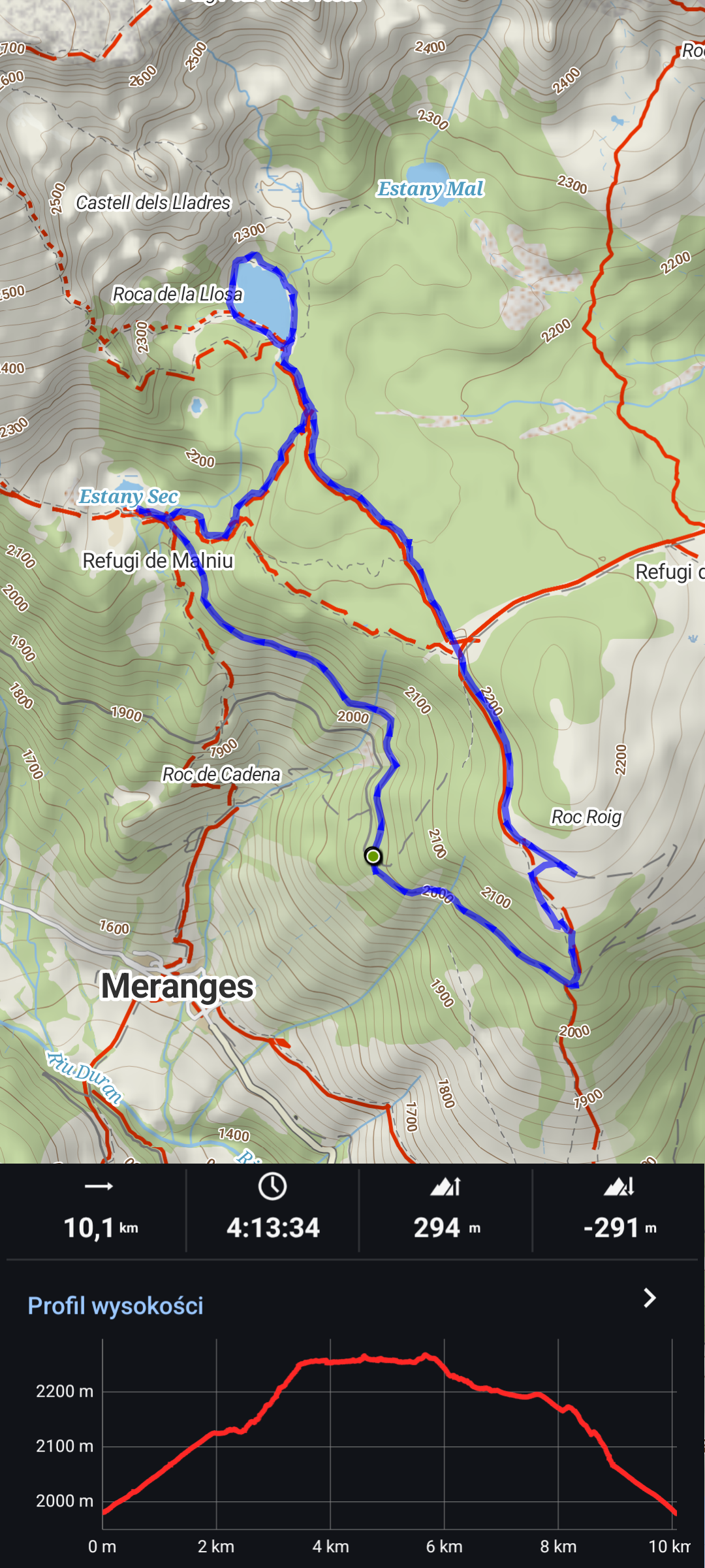 Po paru kilometrach i 145 m w górę spokojnej drogi (w końcu to droga dojazdowa) doszliśmy do schroniska Refugi de Malniu (2125 m) i towarzyszącego mu jeziora Estany Sec (2127 m).