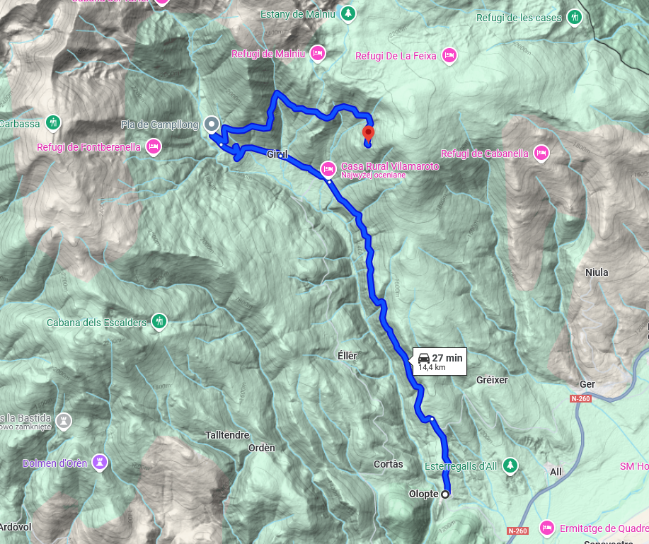 Dojazd z Olopte zajmuje nieco ponad pół godziny. Mijamy Bellver de Cedanya i w miejscowości Martinet de Cerdanya przecinamy rzekę i wspinamy się wąską górską drogą na południe wgłąb pasma Cadí-Moixeró. Za Estana dołączyliśmy do stada krów, które również podążały do polany Coll de Pallers (1502 m), gdzie jest parking i początek szlaku.