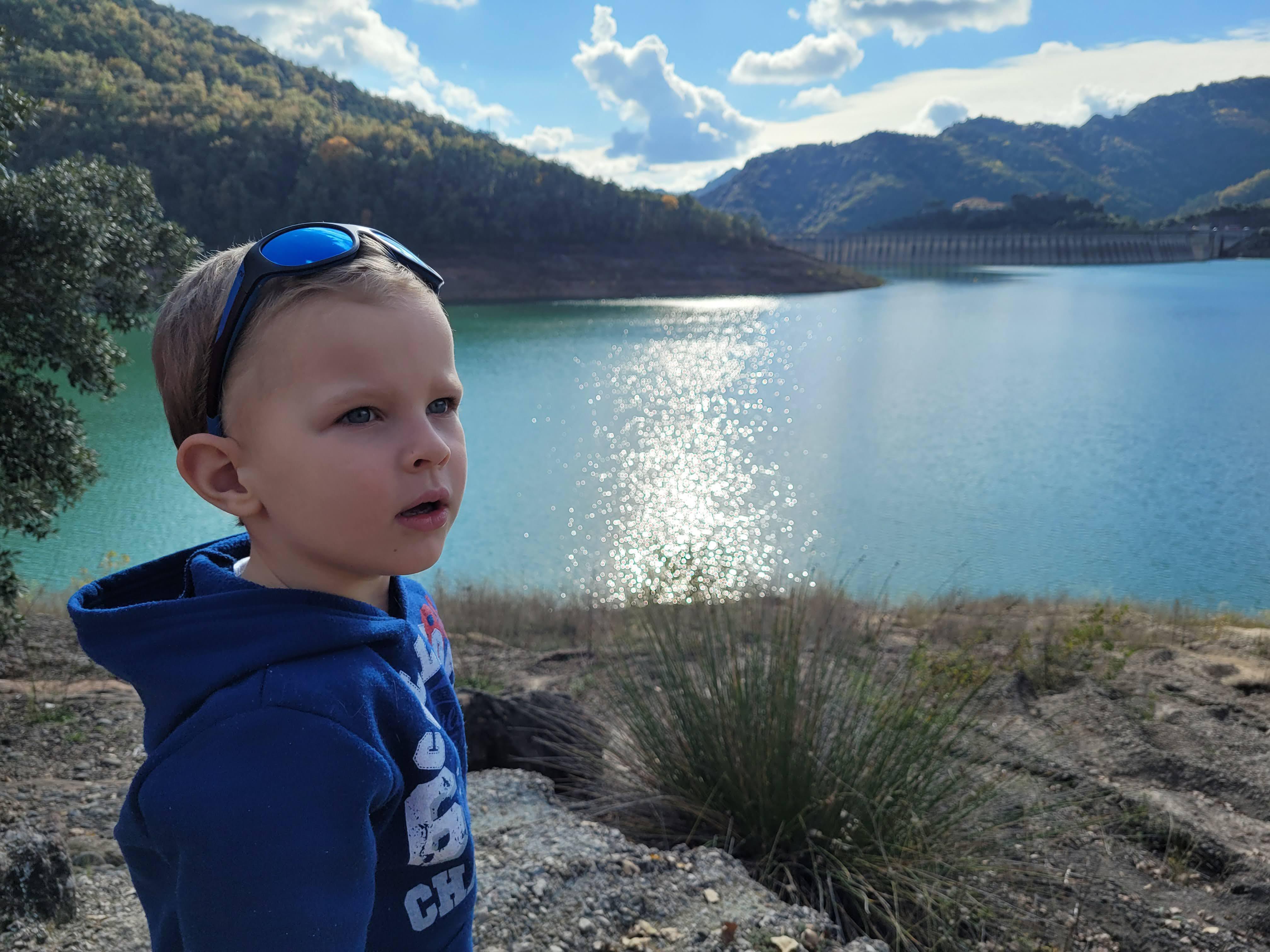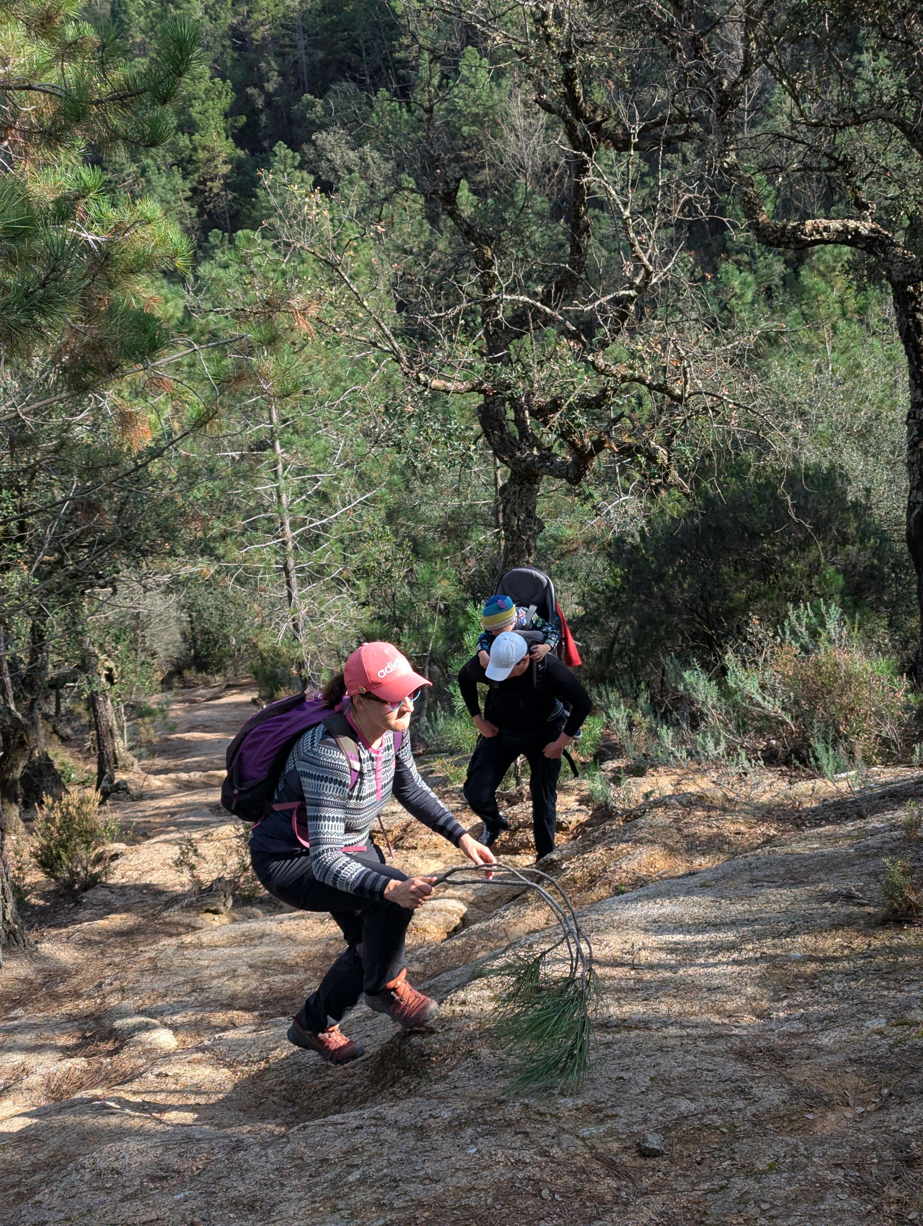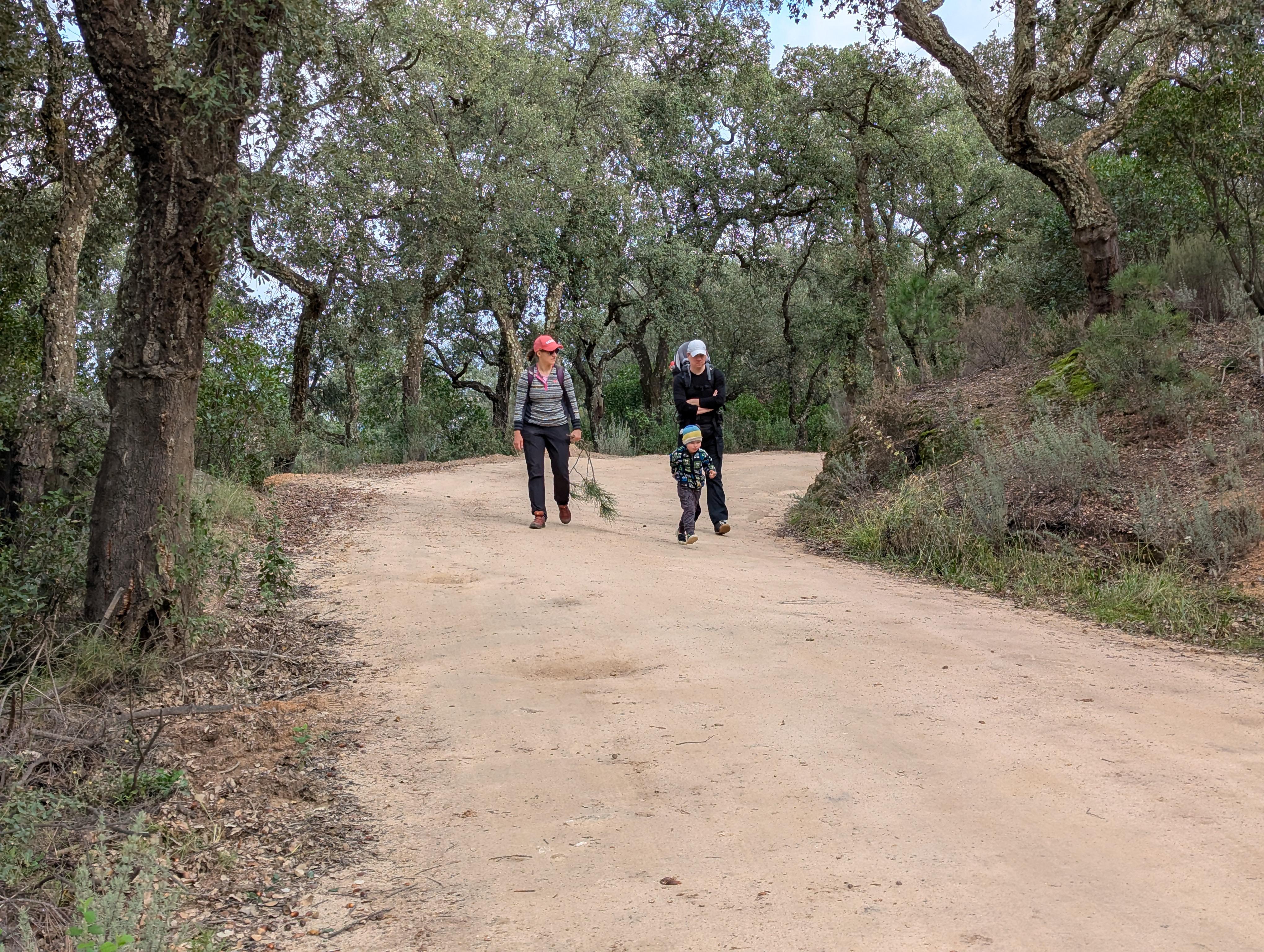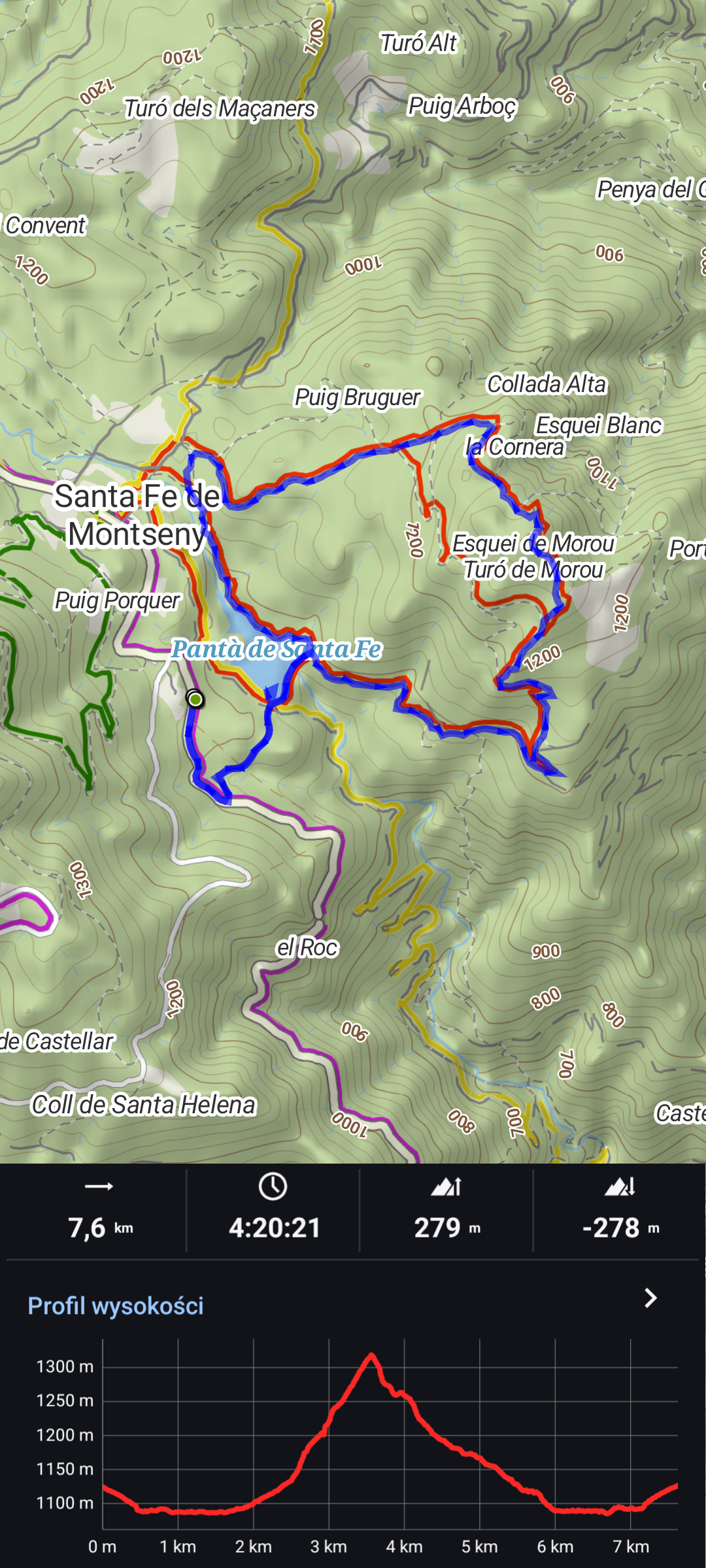 Szlak zaczynał się od zalewu Pantà de Santa Fe (1075 m), utworzonego przez tamę po której przeszliśmy na drugą stronę. Dalej poszliśmy odwrotnie do ruchu wskazówk zegara. To był przyjemny, szeroki, leśny szlak — idealny na sobotni wypad za miasto dla ludzi w każdym wieku. Były zarówno dzieci jak i ludzi starsi. My wybraliśmy dłuższy wariant szlaku przez szczyt Turó de Morou (1311 m). Sam szczyt łatwo było przegapić, bo był płaski i w lesie. Ale kawałek dalej była fajna skała Esquei de Morou (1290 m). Po zejściu drugą stroną zatrzymaliśmy się jeszcze przy wodospadzie i zalewie, gdzie Kuba mógł powrzucać kamienie do wody.