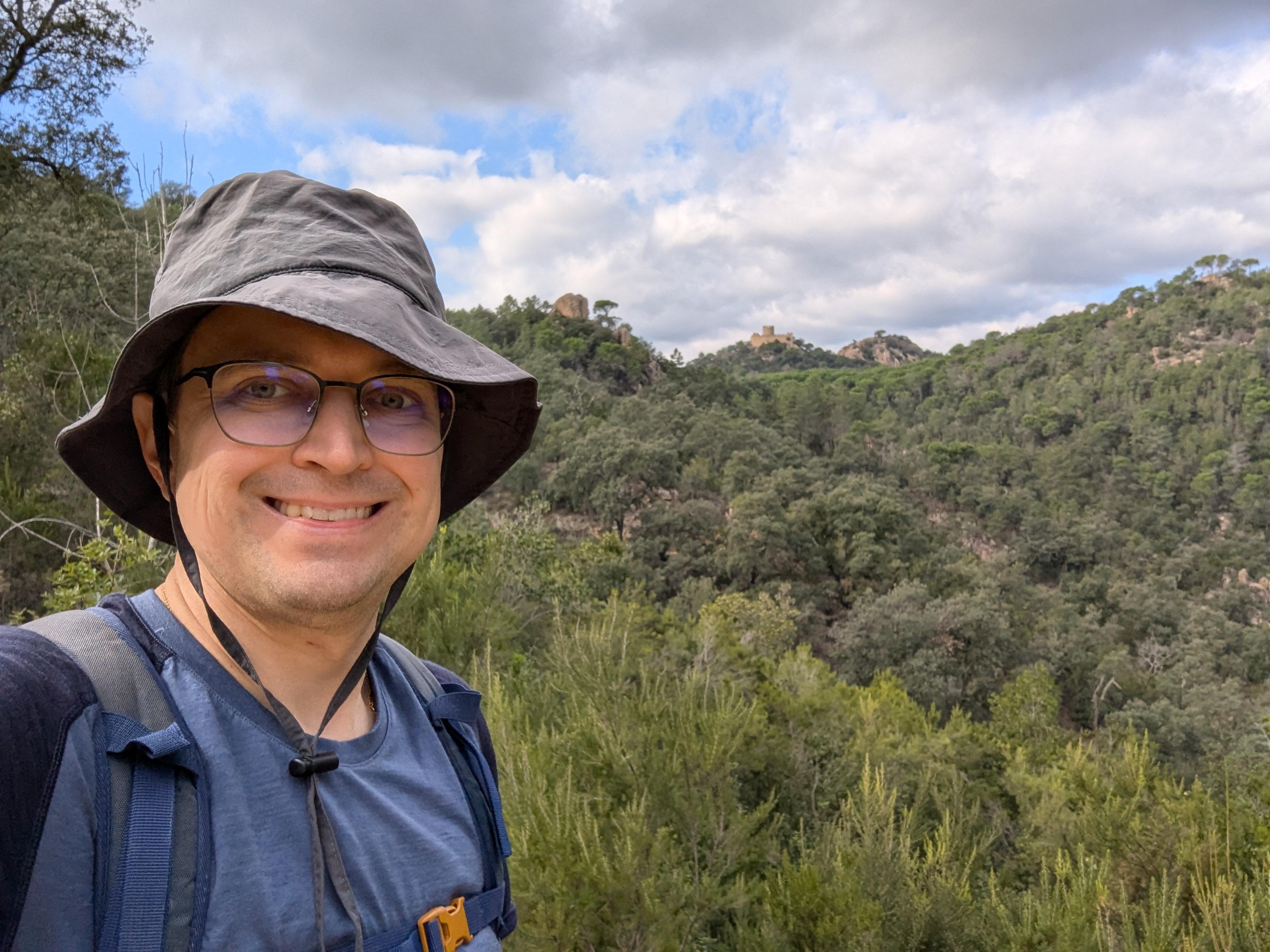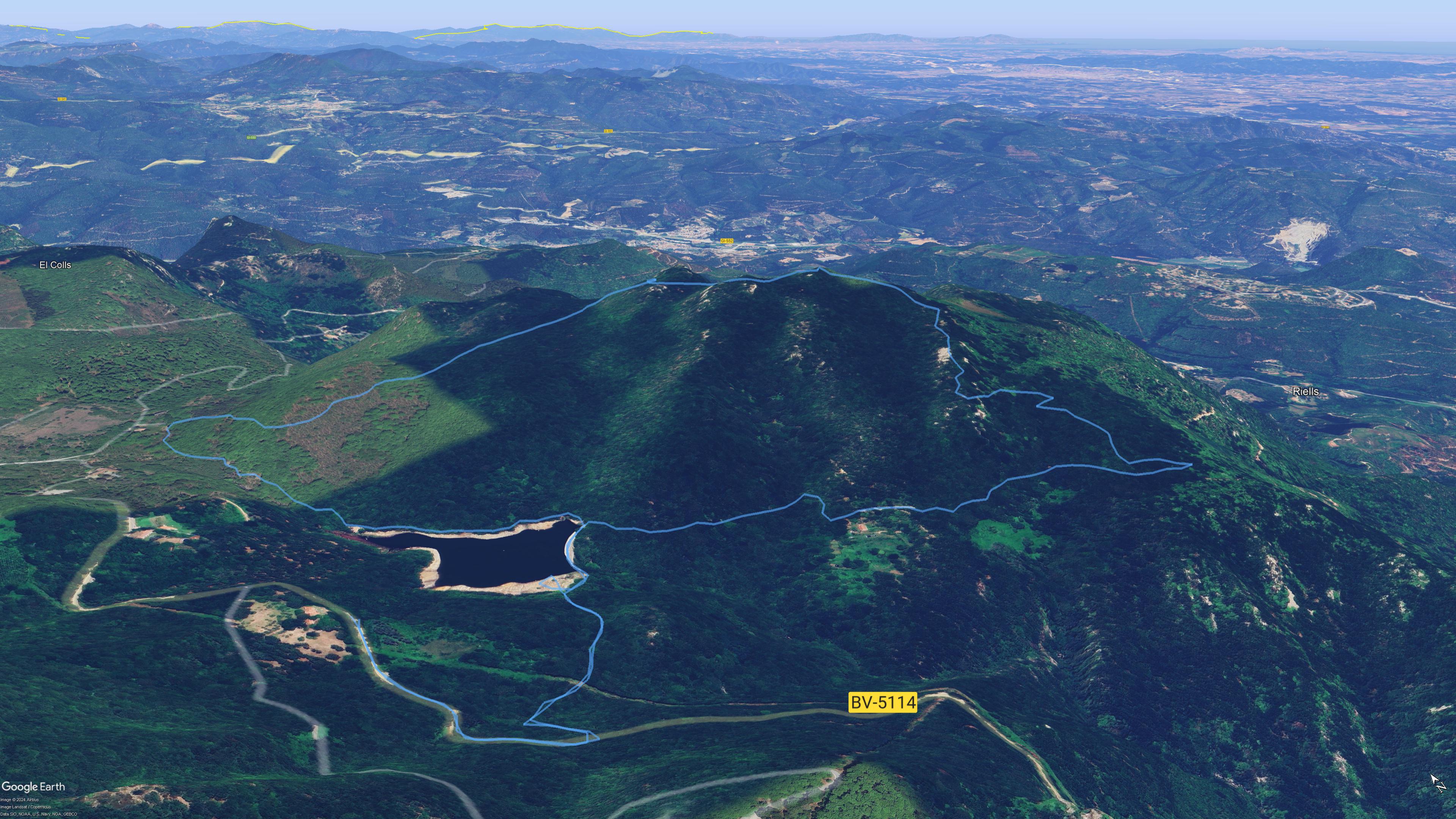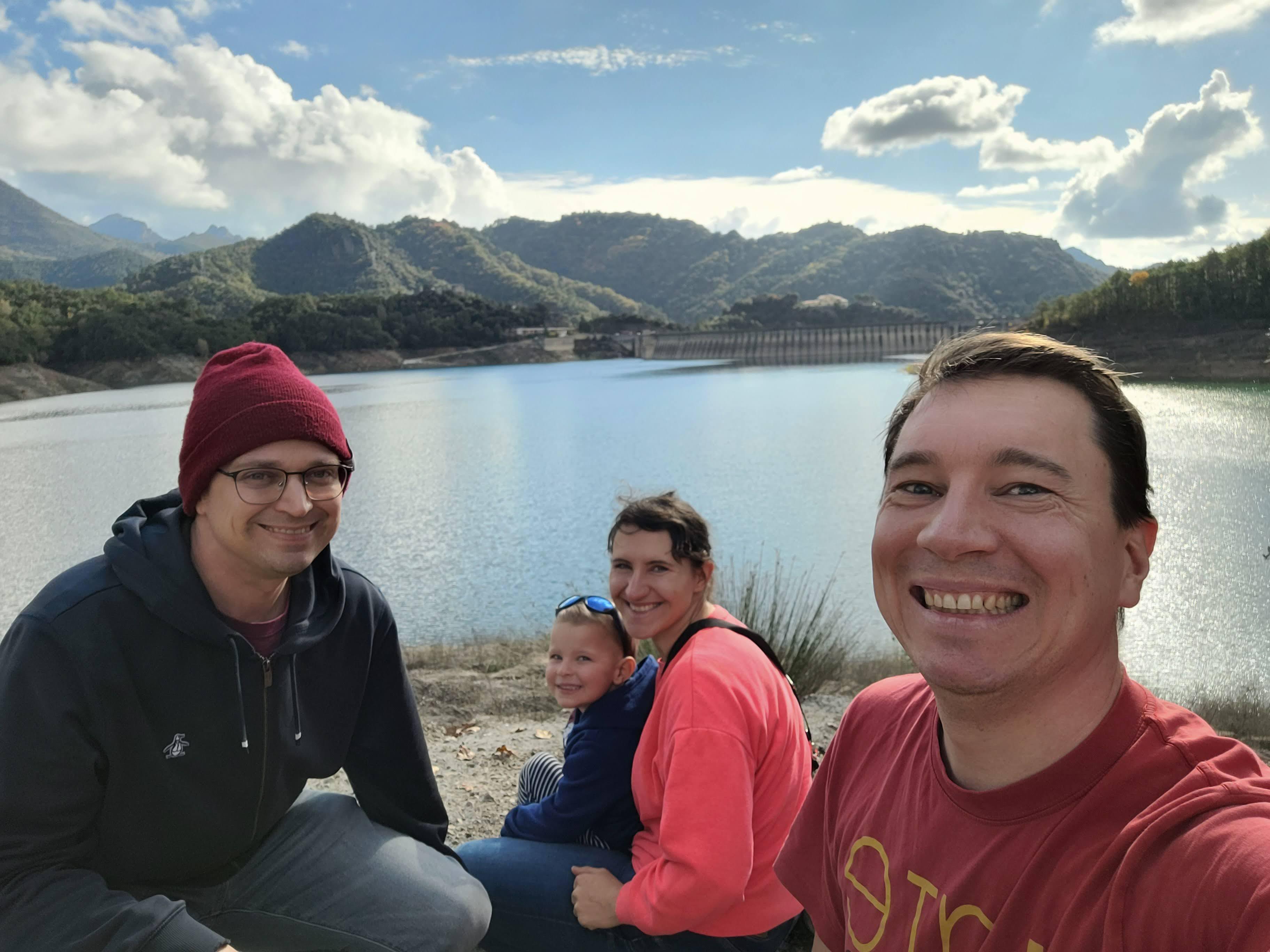 Szlak zaczynał się od zalewu Pantà de Santa Fe (1075 m), utworzonego przez tamę po której przeszliśmy na drugą stronę. Dalej poszliśmy odwrotnie do ruchu wskazówk zegara. To był przyjemny, szeroki, leśny szlak — idealny na sobotni wypad za miasto dla ludzi w każdym wieku. Były zarówno dzieci jak i ludzi starsi. My wybraliśmy dłuższy wariant szlaku przez szczyt Turó de Morou (1311 m). Sam szczyt łatwo było przegapić, bo był płaski i w lesie. Ale kawałek dalej była fajna skała Esquei de Morou (1290 m). Po zejściu drugą stroną zatrzymaliśmy się jeszcze przy wodospadzie i zalewie, gdzie Kuba mógł powrzucać kamienie do wody.