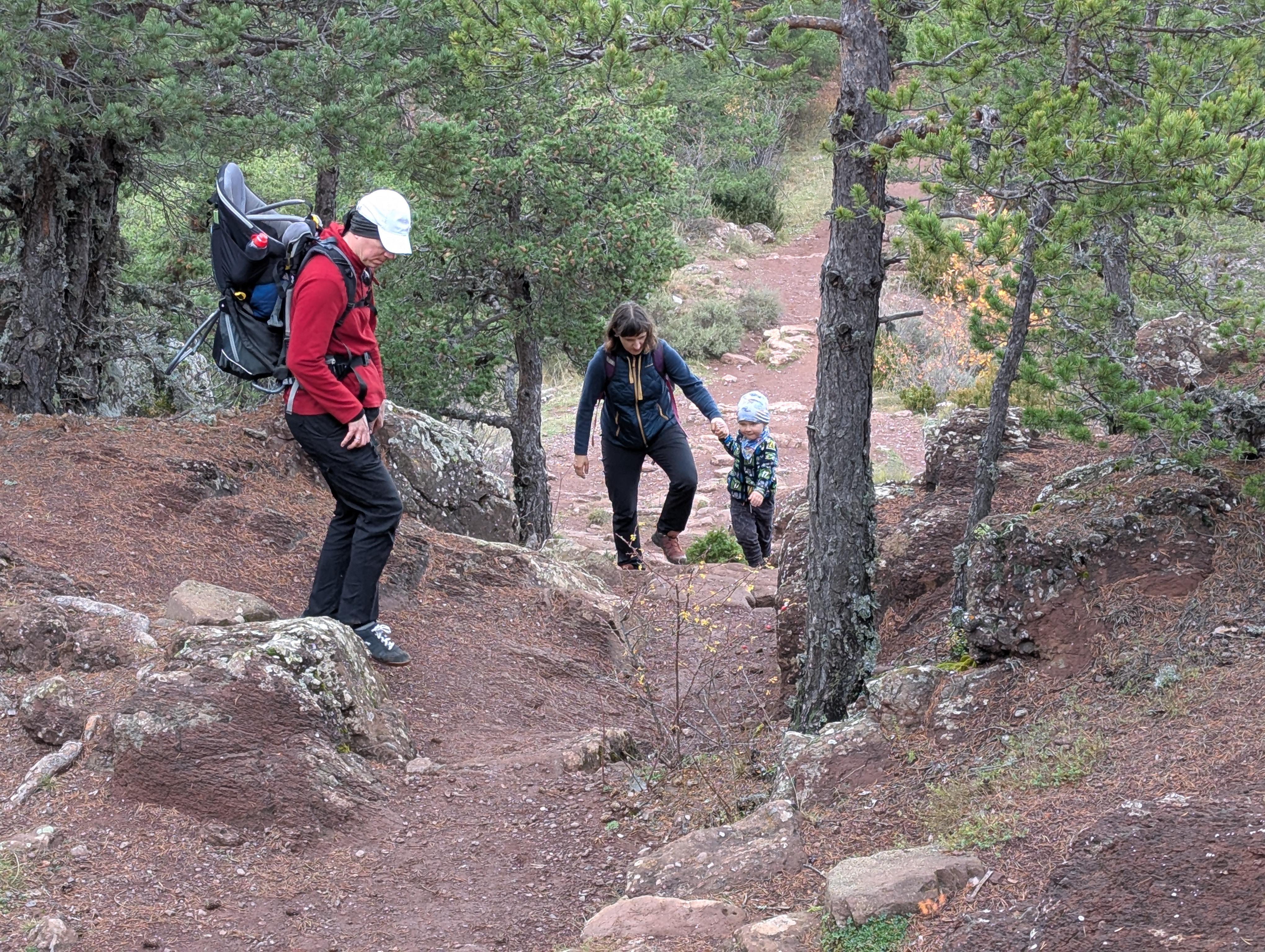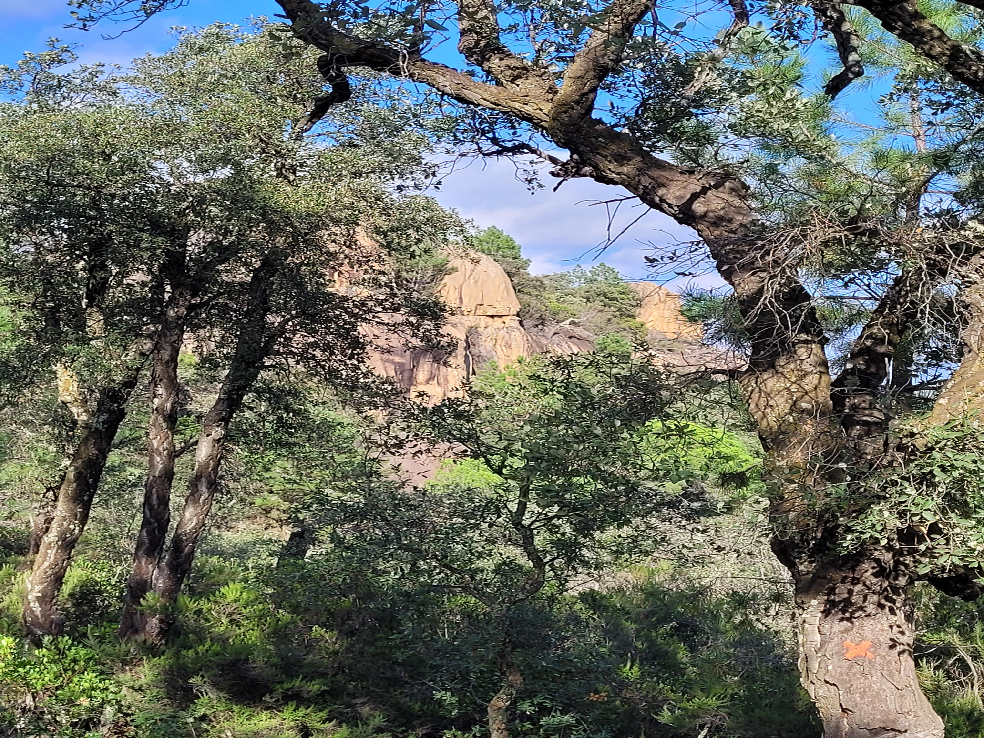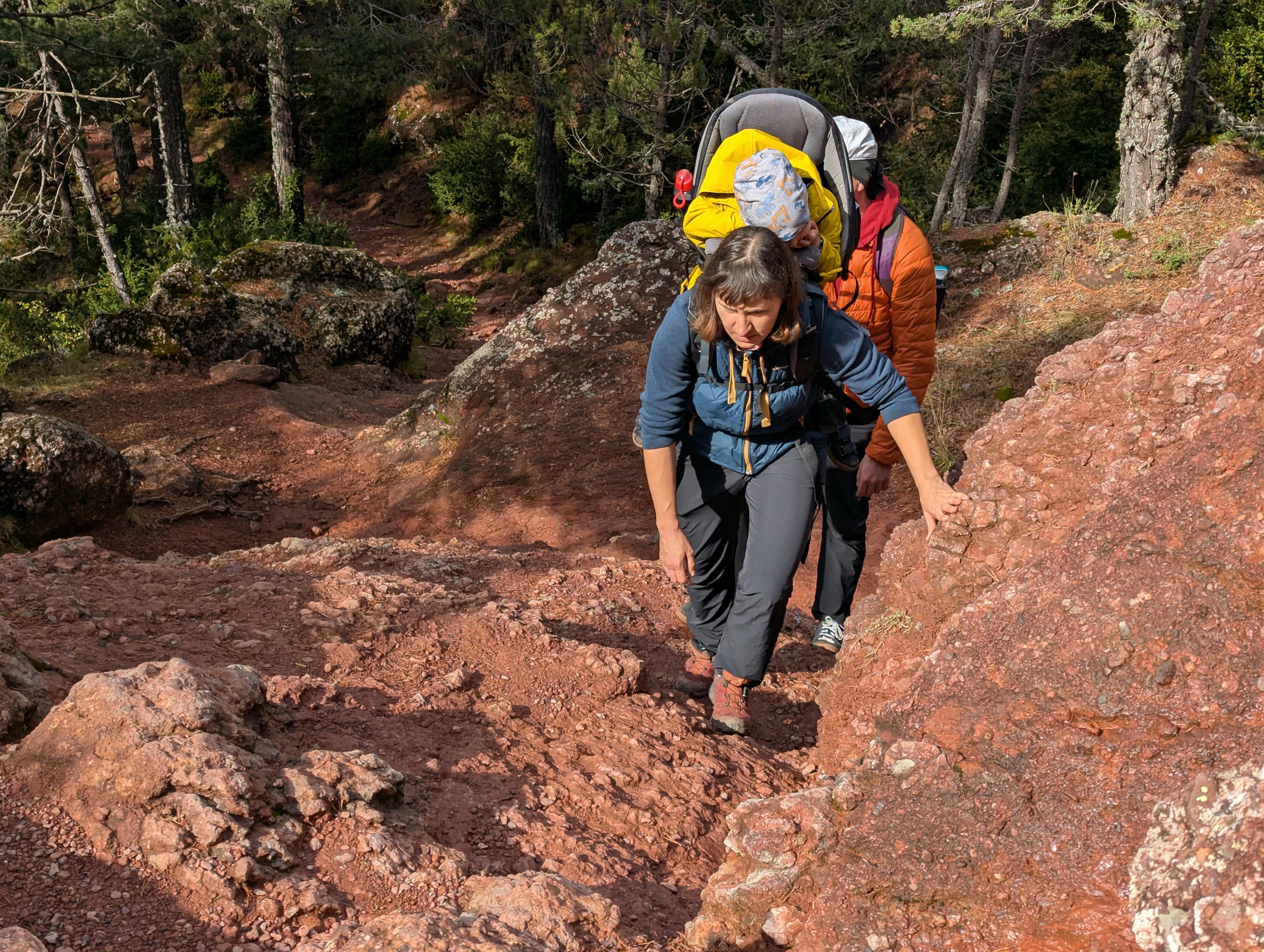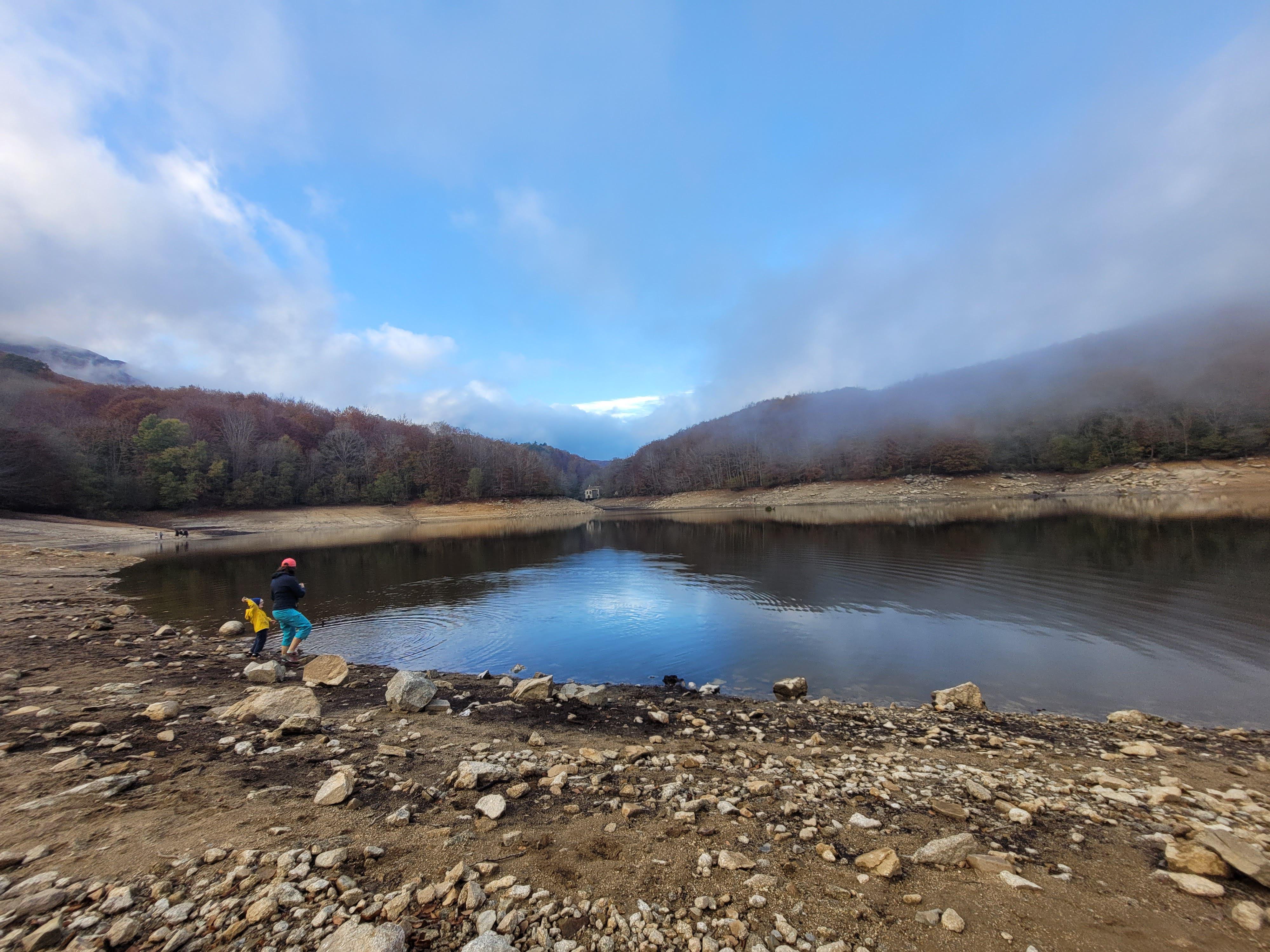 Szlak zaczynał się od zalewu Pantà de Santa Fe (1075 m), utworzonego przez tamę po której przeszliśmy na drugą stronę. Dalej poszliśmy odwrotnie do ruchu wskazówk zegara. To był przyjemny, szeroki, leśny szlak — idealny na sobotni wypad za miasto dla ludzi w każdym wieku. Były zarówno dzieci jak i ludzi starsi. My wybraliśmy dłuższy wariant szlaku przez szczyt Turó de Morou (1311 m). Sam szczyt łatwo było przegapić, bo był płaski i w lesie. Ale kawałek dalej była fajna skała Esquei de Morou (1290 m). Po zejściu drugą stroną zatrzymaliśmy się jeszcze przy wodospadzie i zalewie, gdzie Kuba mógł powrzucać kamienie do wody.