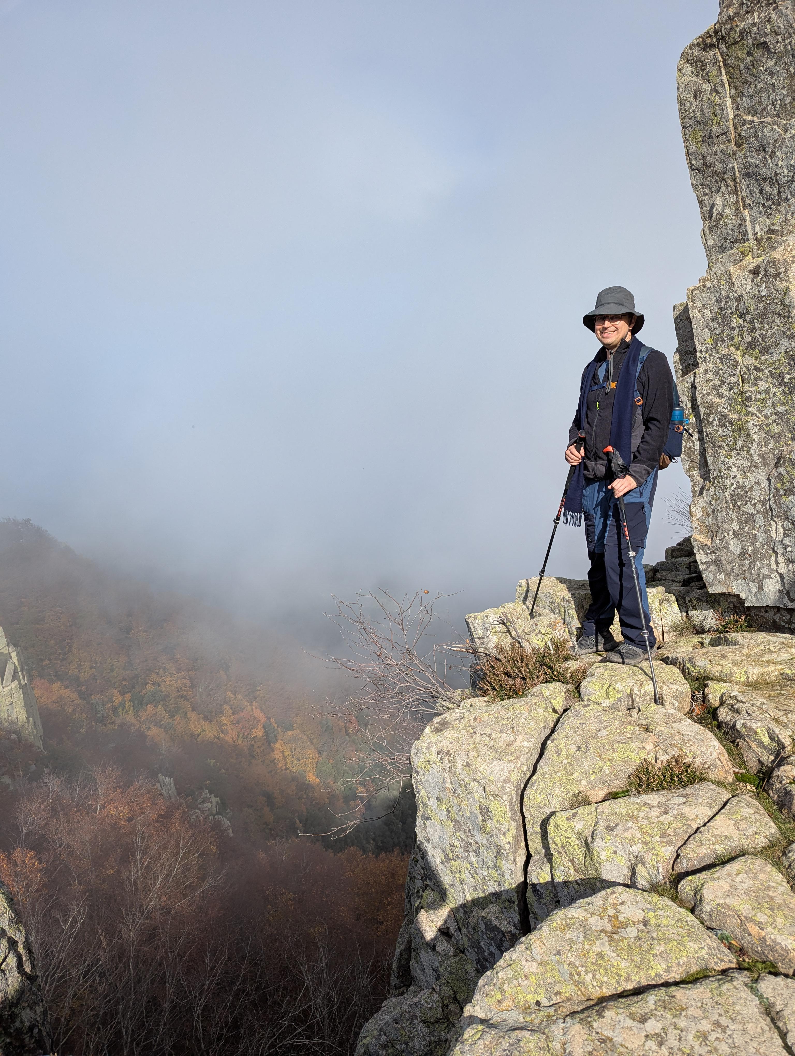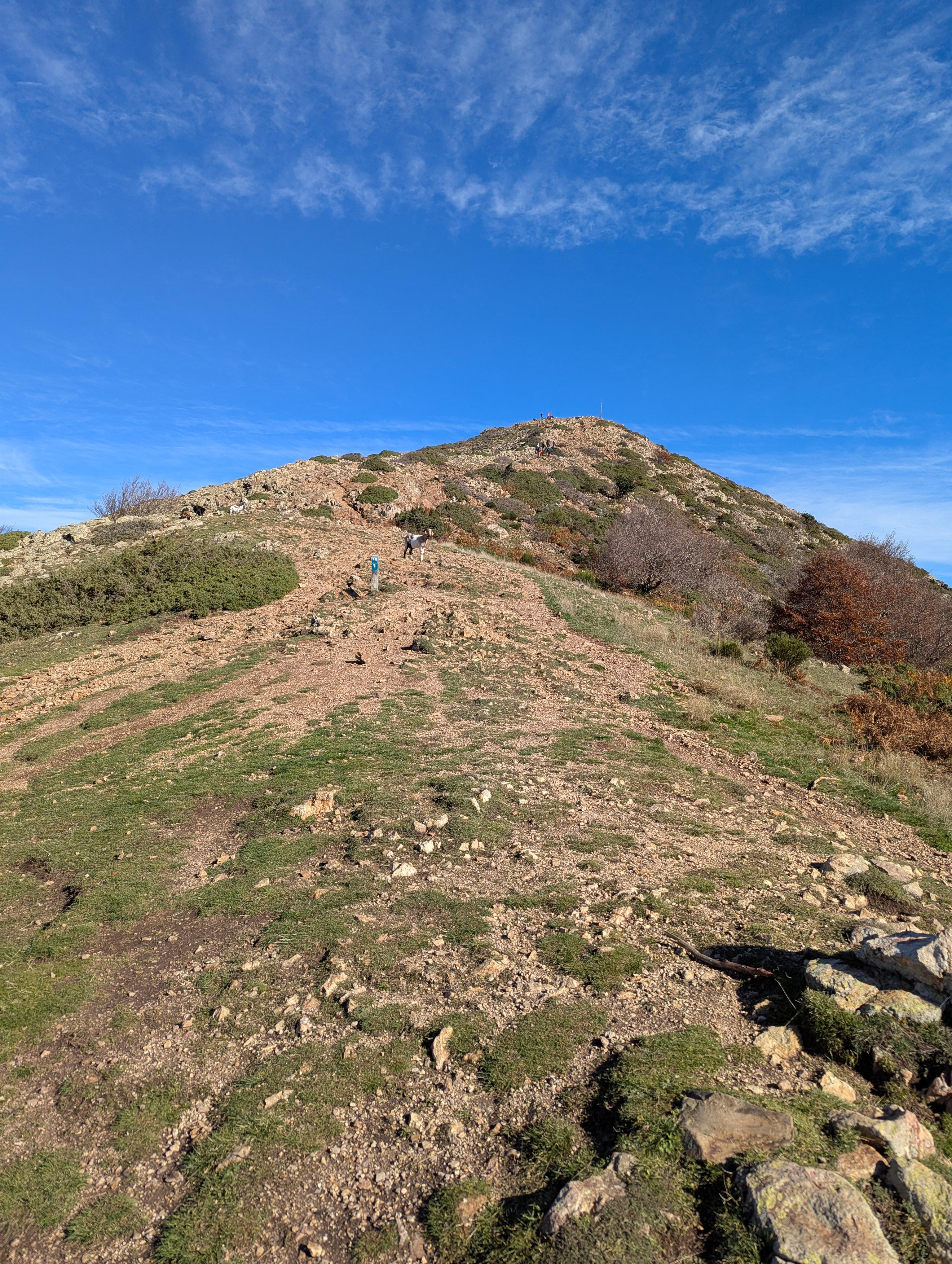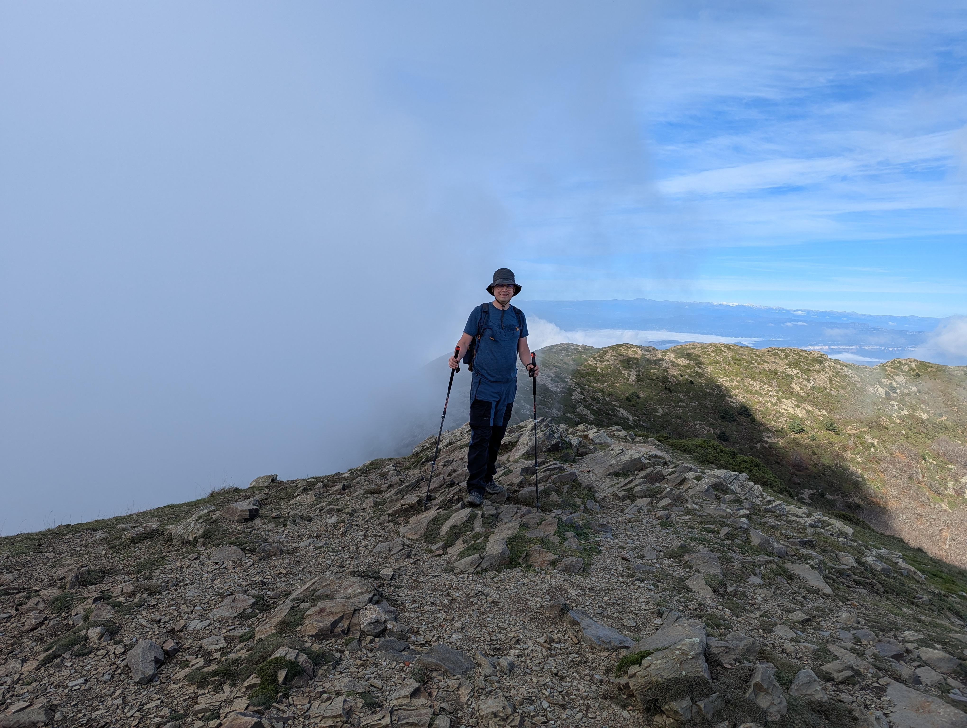 Z Los Agudes szlak biegł już w zasadzie bokiem grani, żeby później spiralnie wspiąć się na Turó de l’Home (1704 m). W odróżnieniu od skalnego Los Agudes, Turó de l’Home ma sylwetkę kopy. Na szczycie znalazły się symbole niepodległościowe. Zastała nas tam też chmura przechodząca przez grzbiet, dająca ciekawy efekt wizualny.
