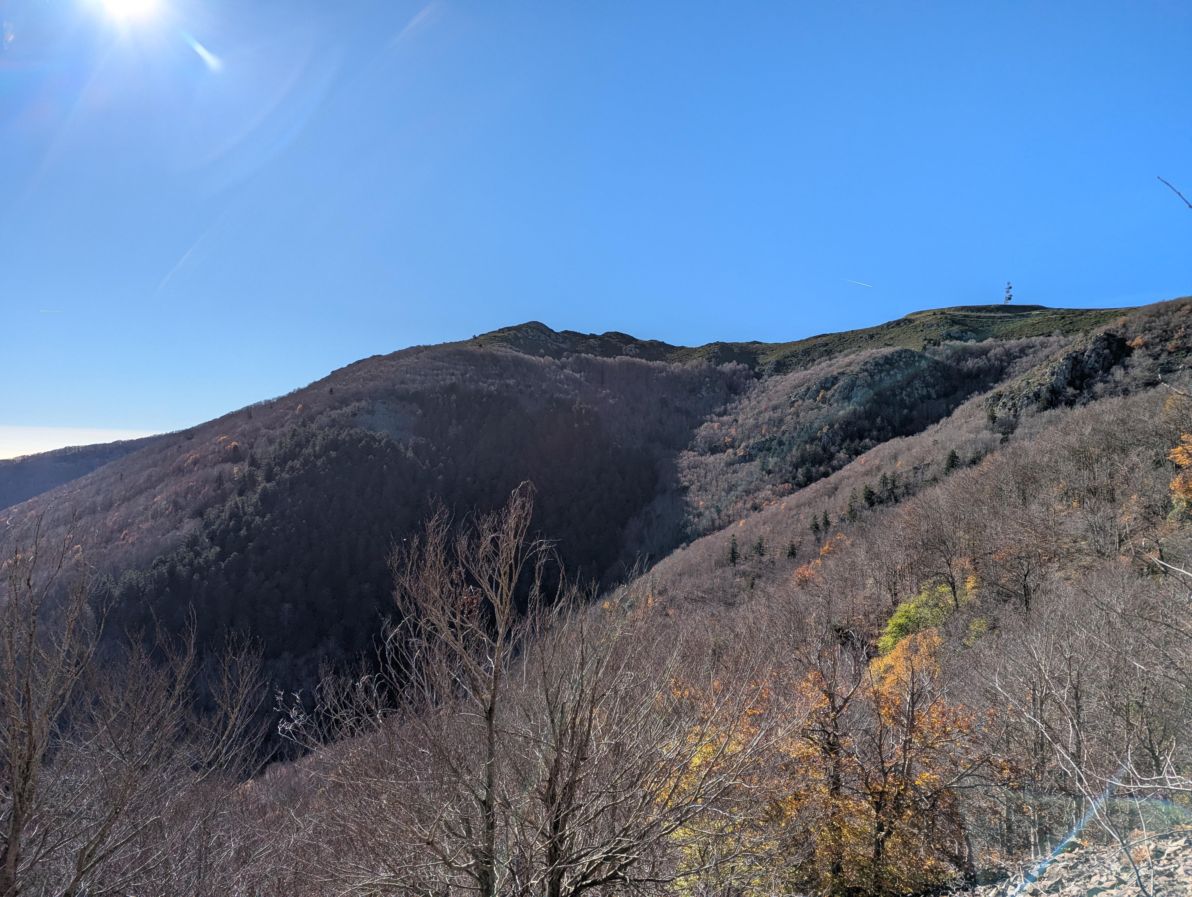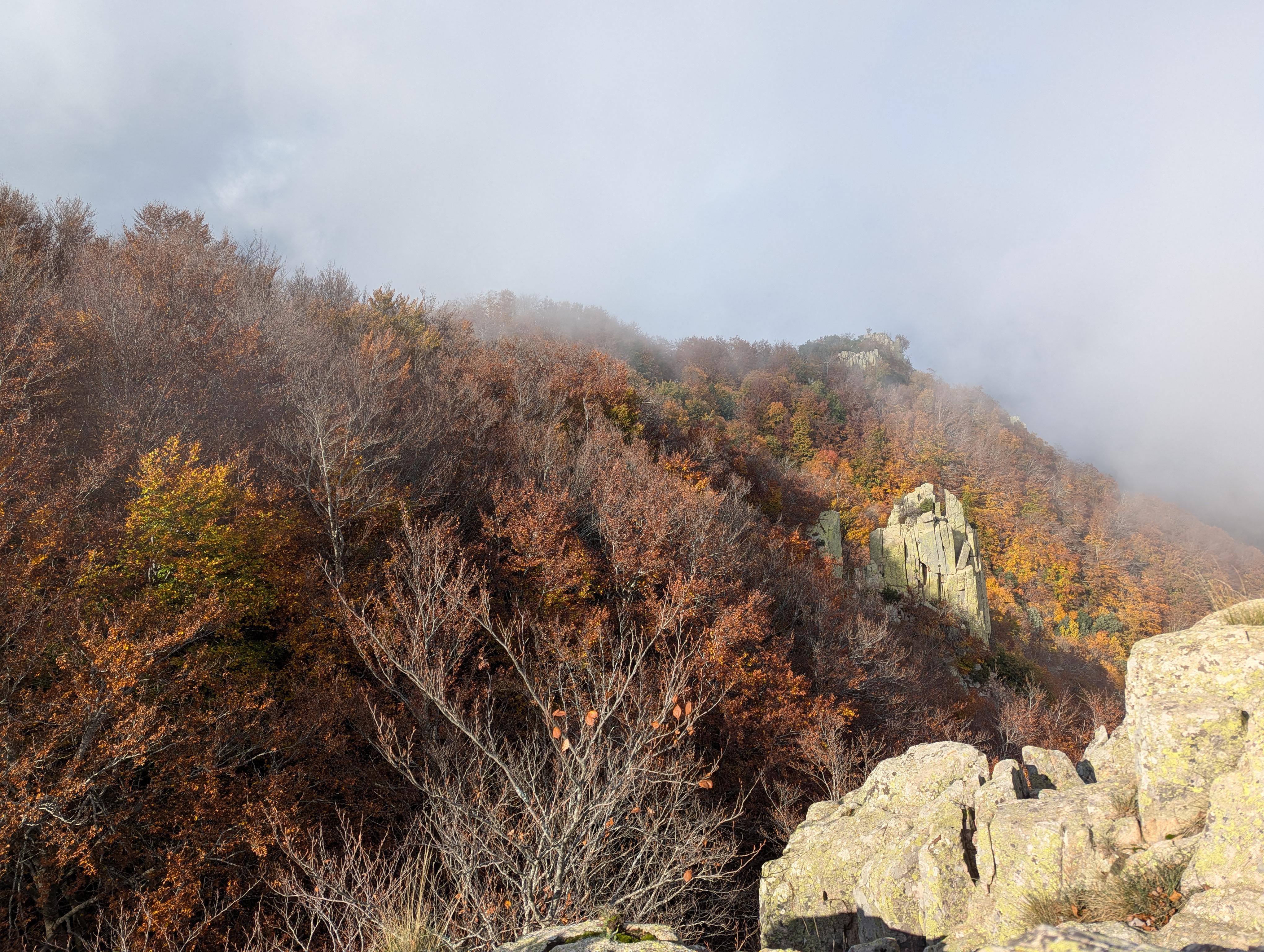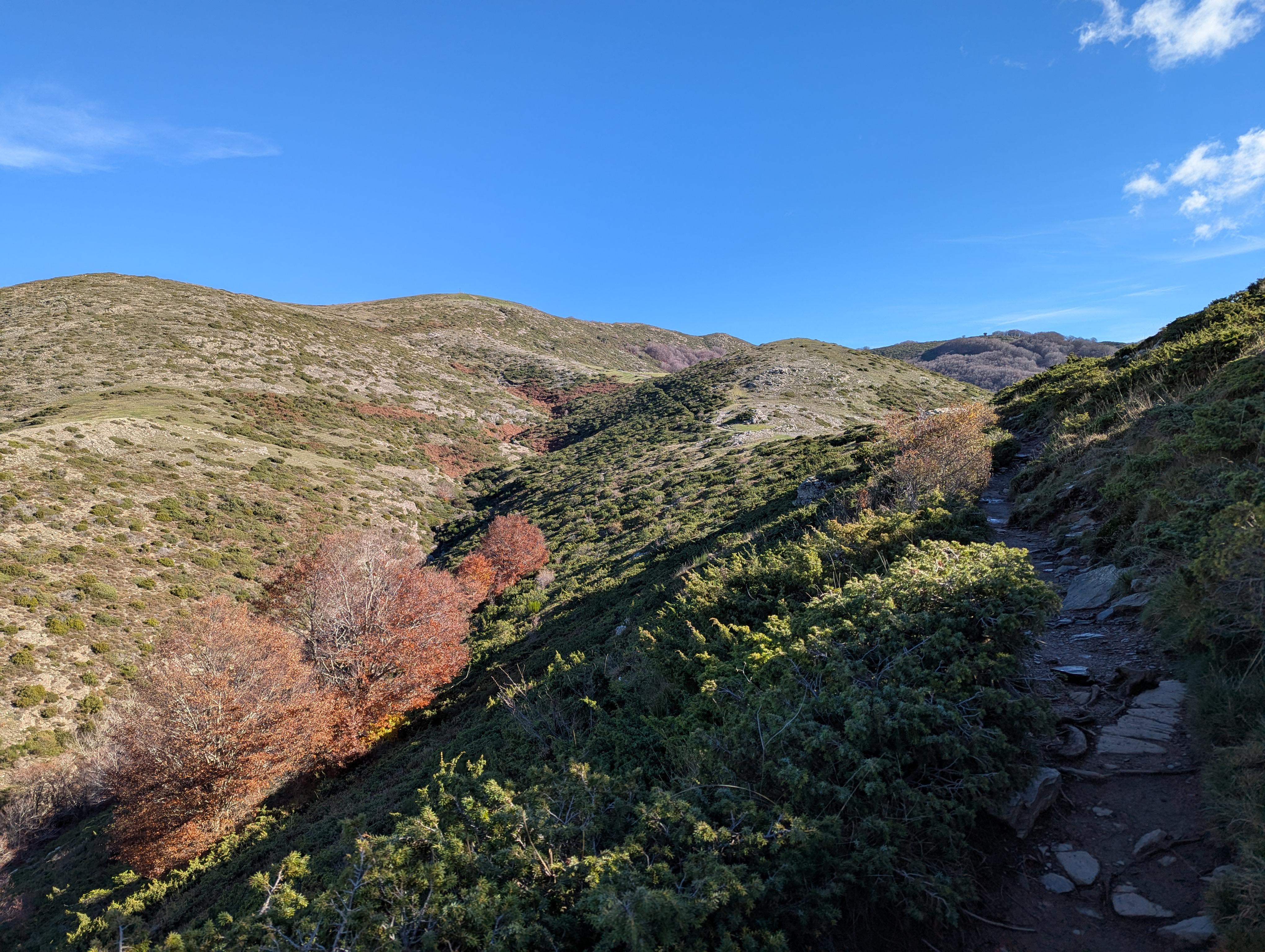 Podejście było dosyć intensywne, ale utrzymywaliśmy dobre tempo. Na dole szlak biegł przez las i momentami był praktycznie niewidoczny, ukryty pod warstwą jesiennych liści. Przez jakiś czas odsłoniła się lewa - południowa strona z widokiem na Turó de l’Home. Później zrobiliśmy zakole w prawo aż do wyjścia na grań, gdzie odpoczywały kozy. Granią trzeba było przejść kawałek na północ i już po skałach znaleźliśmy się na Los Agudes (1704 m). Z Los Agudes rozpościerał się widok na wszystkie strony. Można było zobaczyć siostrzany szczyt Turó de l’Home, ale również masyw Matagalls (1697 m), na który wcześniej wszedłem z Gosią.