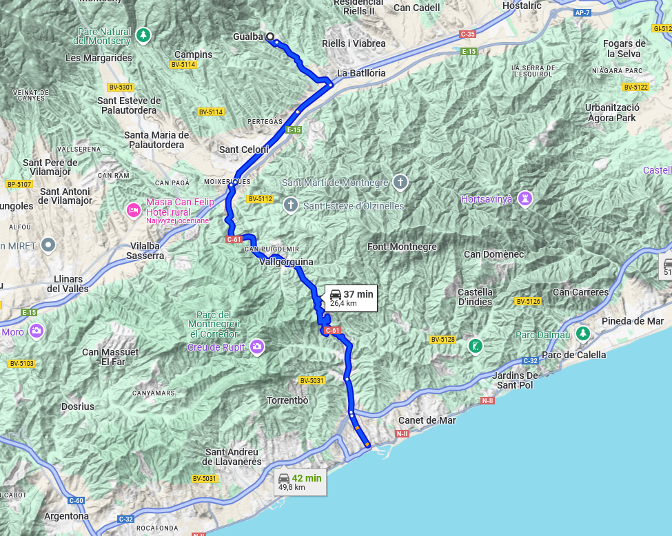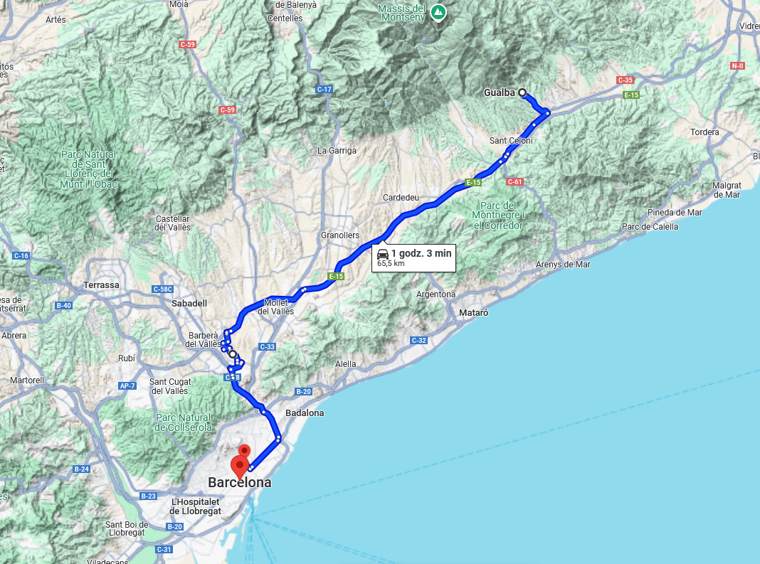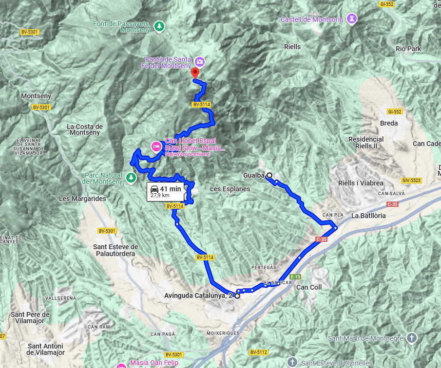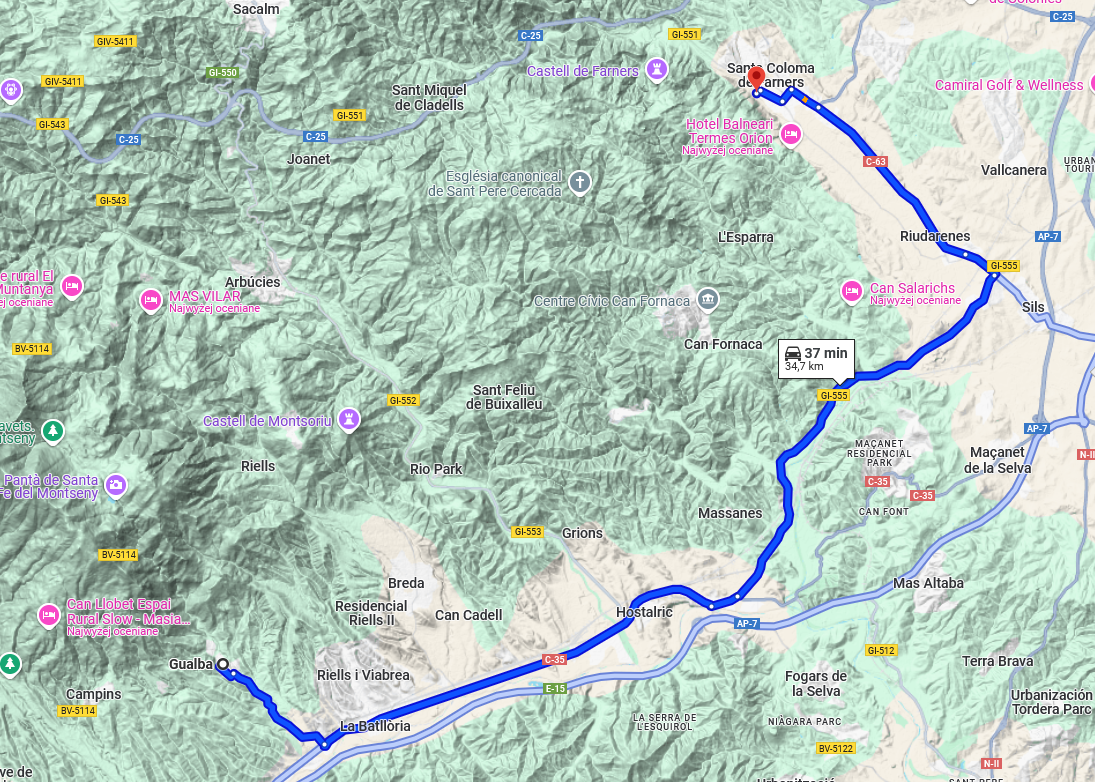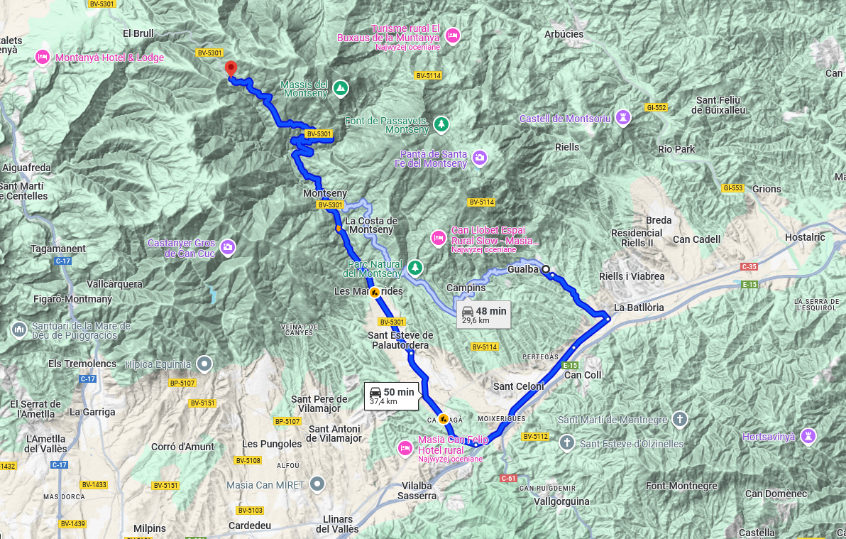 Drugi nocleg zarezerwowaliśmy będąc w Olopte. Chcieliśmy być bliżej wybrzeża i lotniska, a przy tym mieć dostęp do fajnych szlaków. Wybór nie był tak szeroki, jak by się wydawało z uwagi na wyższe ceny. Ostatecznie zarezerwowaliśmy Rural Montseny w miasteczku Gualba w rezerwacie krajobrazowym Montseny. Rezerwację mieliśmy od 15:00, więc mogliśmy pojechać o komfortowej godzinie. Cała trasa to raptem 150 km i nieco ponad 2 godziny.