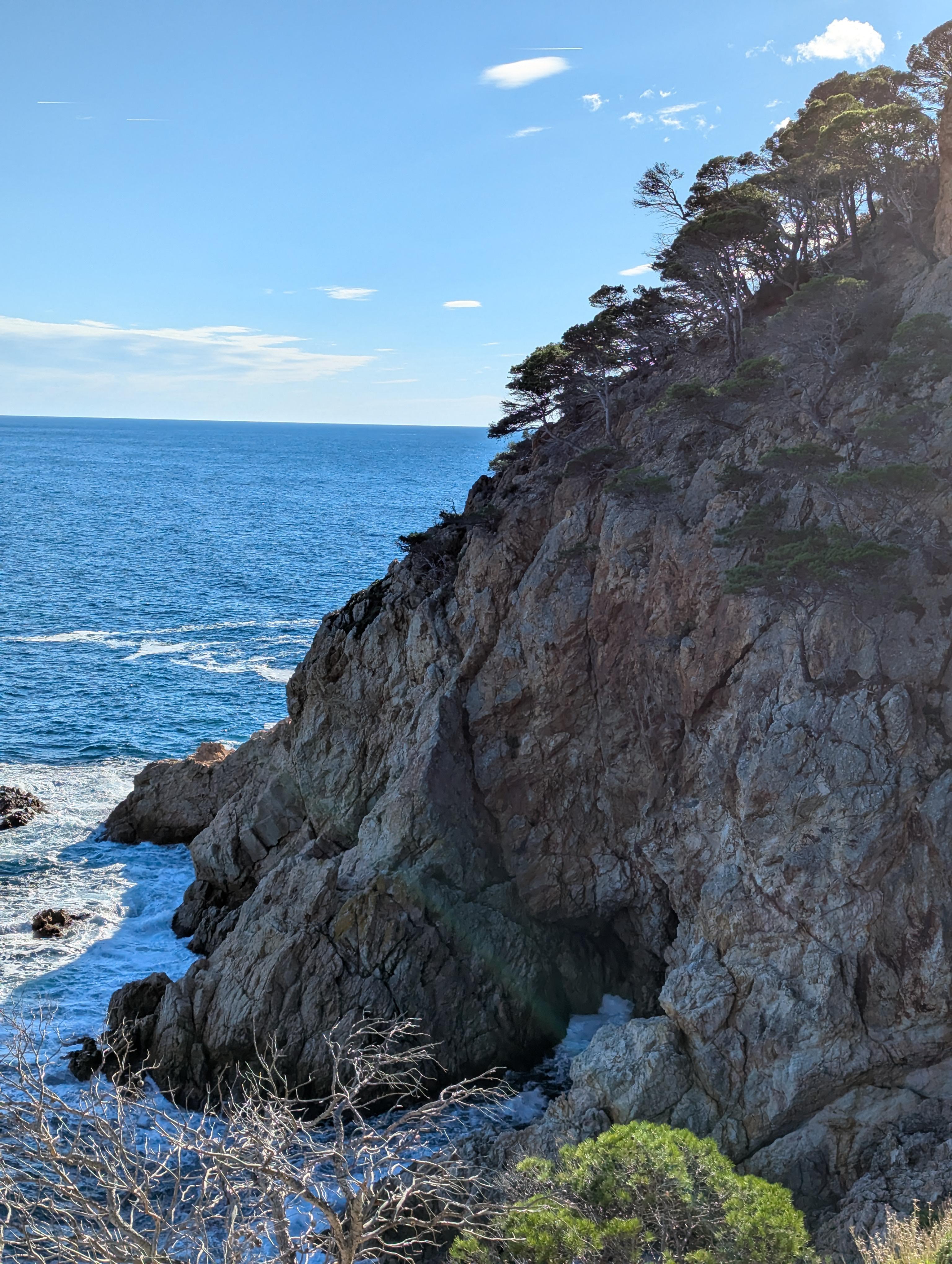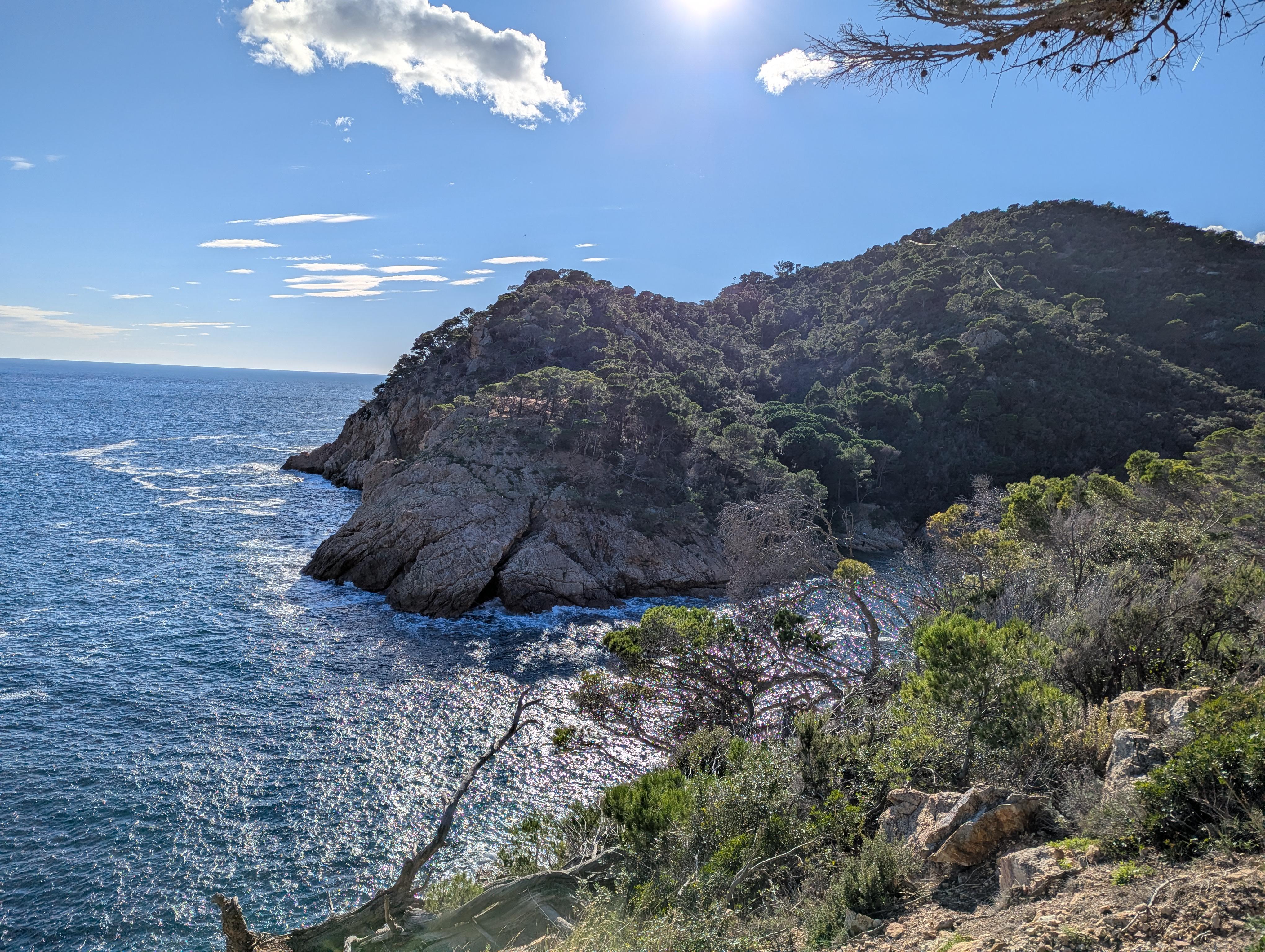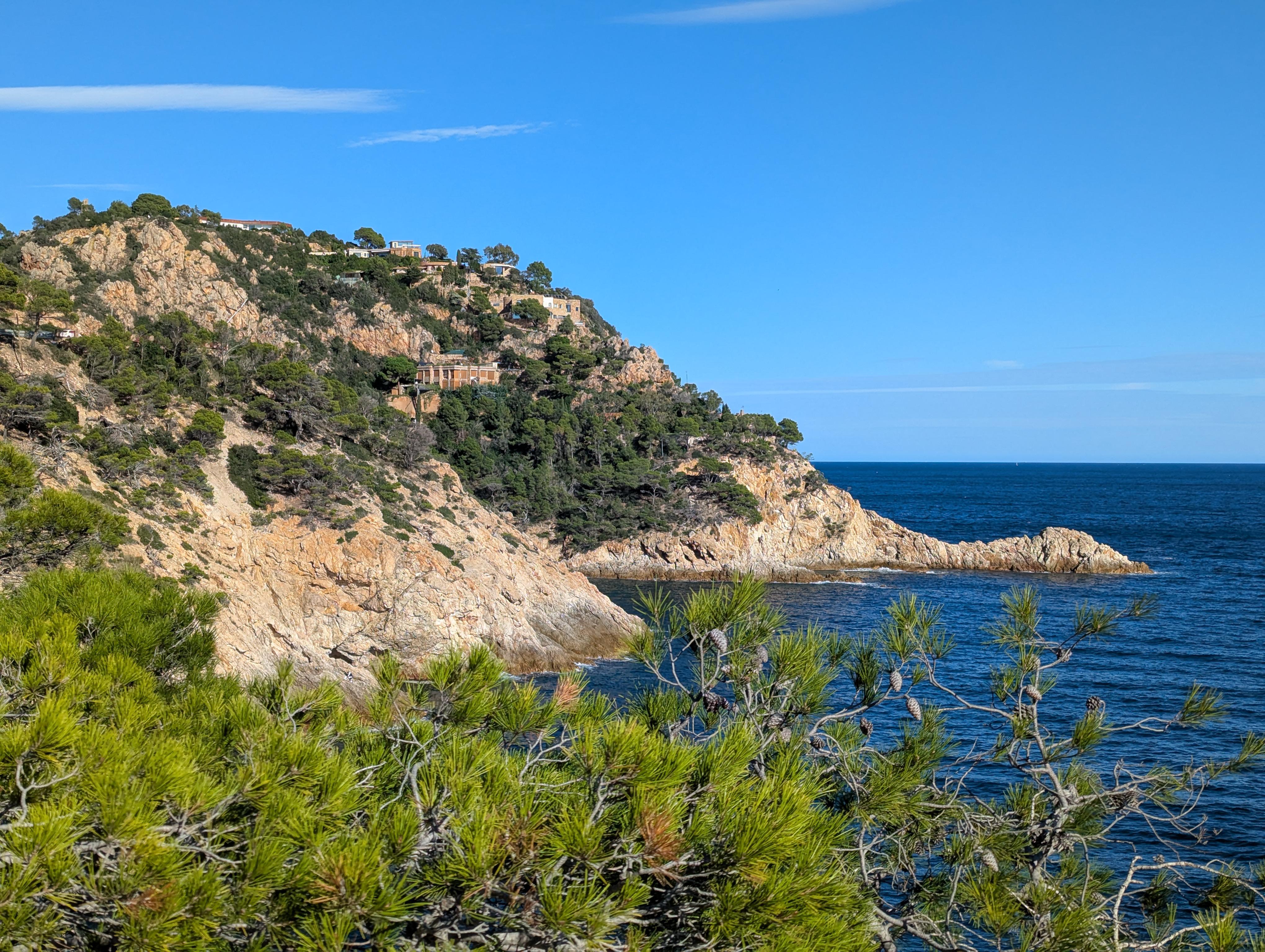 Następnego dnia chcieliśmy uniknąć weekendowego tłoku na Monstseny i wybraliśmy się na wybrzeże do Tossa de Mar, skąd poszliśmy ciekawym szlakiem do Cap de Pola, a w zasadzie zatoki Cala Pola. Szlak wił się po klifach i obfitował w podejścia i zejścia. Jednocześnie był bardzo malowniczy, z wieloma punktami widokowymi. W pierwszej fazie wspinał się z miasteczka do drogi biegnącej po klifie, po czym znów schodził skałami aż do plaży w odosobnionej zatoce Cala Bona. Później trzeba było jeszcze przejść przez jeden klif, aby dotrzeć do celu — plaży w zatoce Cala Pola. Do samego cypla Cap de Pola nie doszliśmy. W Cala Pola był spory ośrodek z domkami kampingowymi.