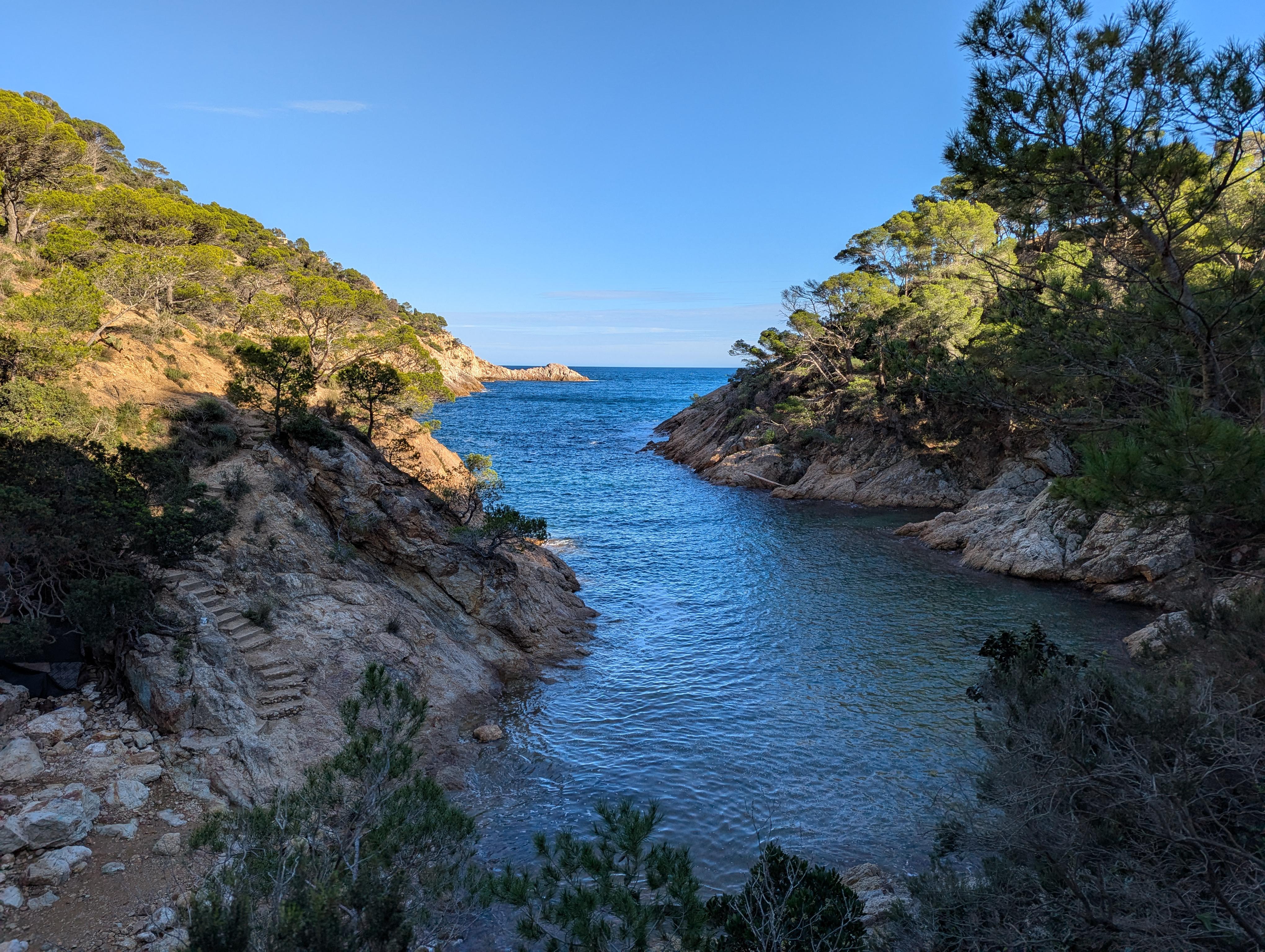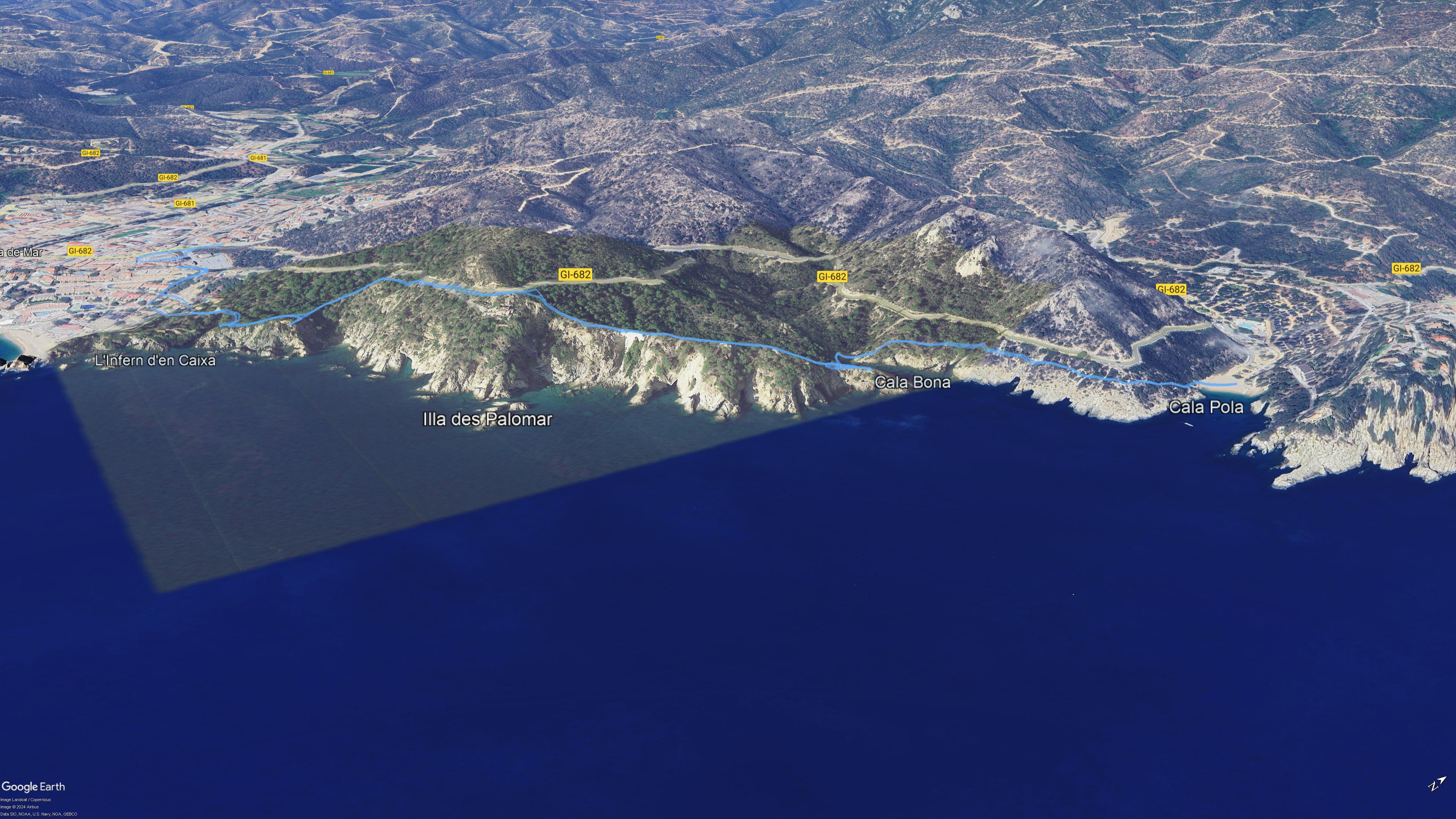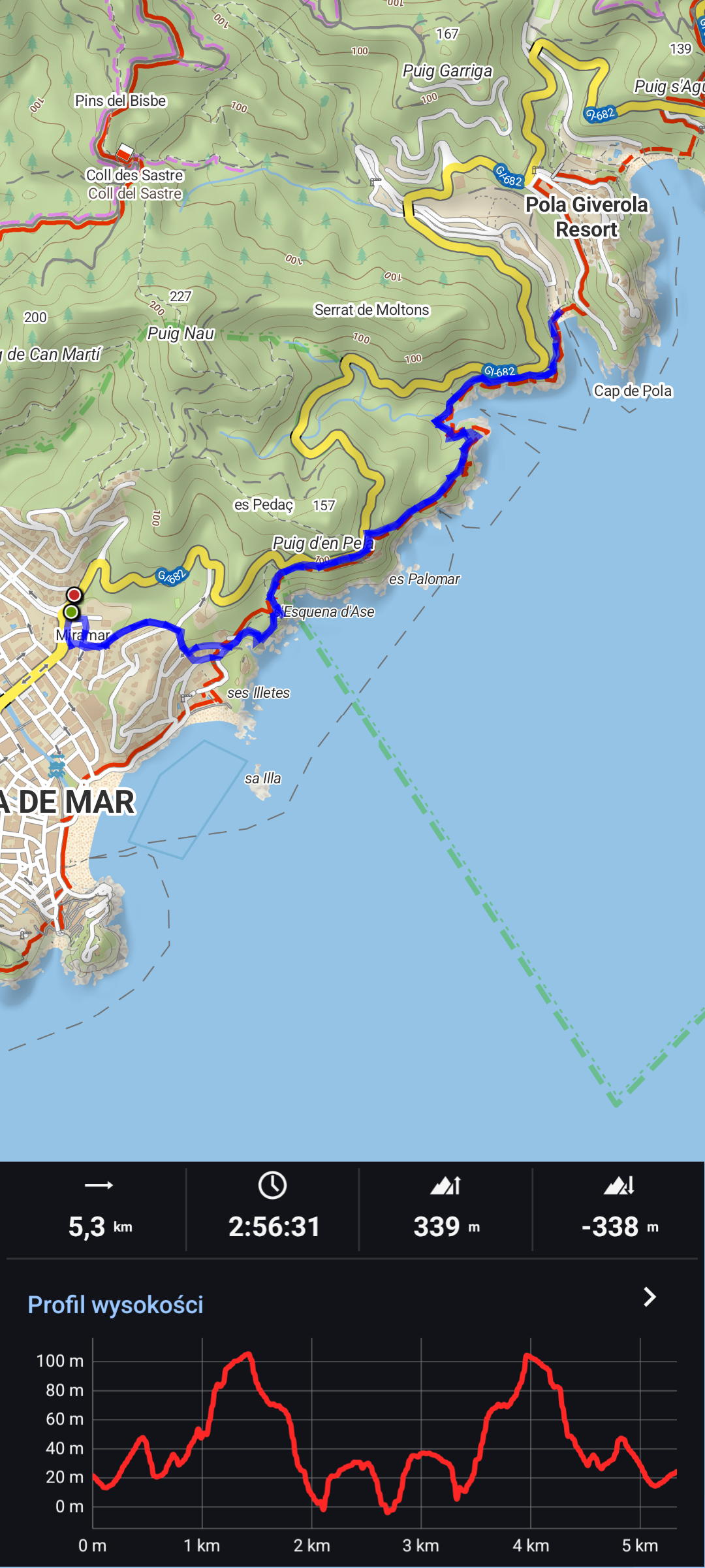 Następnego dnia chcieliśmy uniknąć weekendowego tłoku na Monstseny i wybraliśmy się na wybrzeże do Tossa de Mar, skąd poszliśmy ciekawym szlakiem do Cap de Pola, a w zasadzie zatoki Cala Pola. Szlak wił się po klifach i obfitował w podejścia i zejścia. Jednocześnie był bardzo malowniczy, z wieloma punktami widokowymi. W pierwszej fazie wspinał się z miasteczka do drogi biegnącej po klifie, po czym znów schodził skałami aż do plaży w odosobnionej zatoce Cala Bona. Później trzeba było jeszcze przejść przez jeden klif, aby dotrzeć do celu — plaży w zatoce Cala Pola. Do samego cypla Cap de Pola nie doszliśmy. W Cala Pola był spory ośrodek z domkami kampingowymi.
