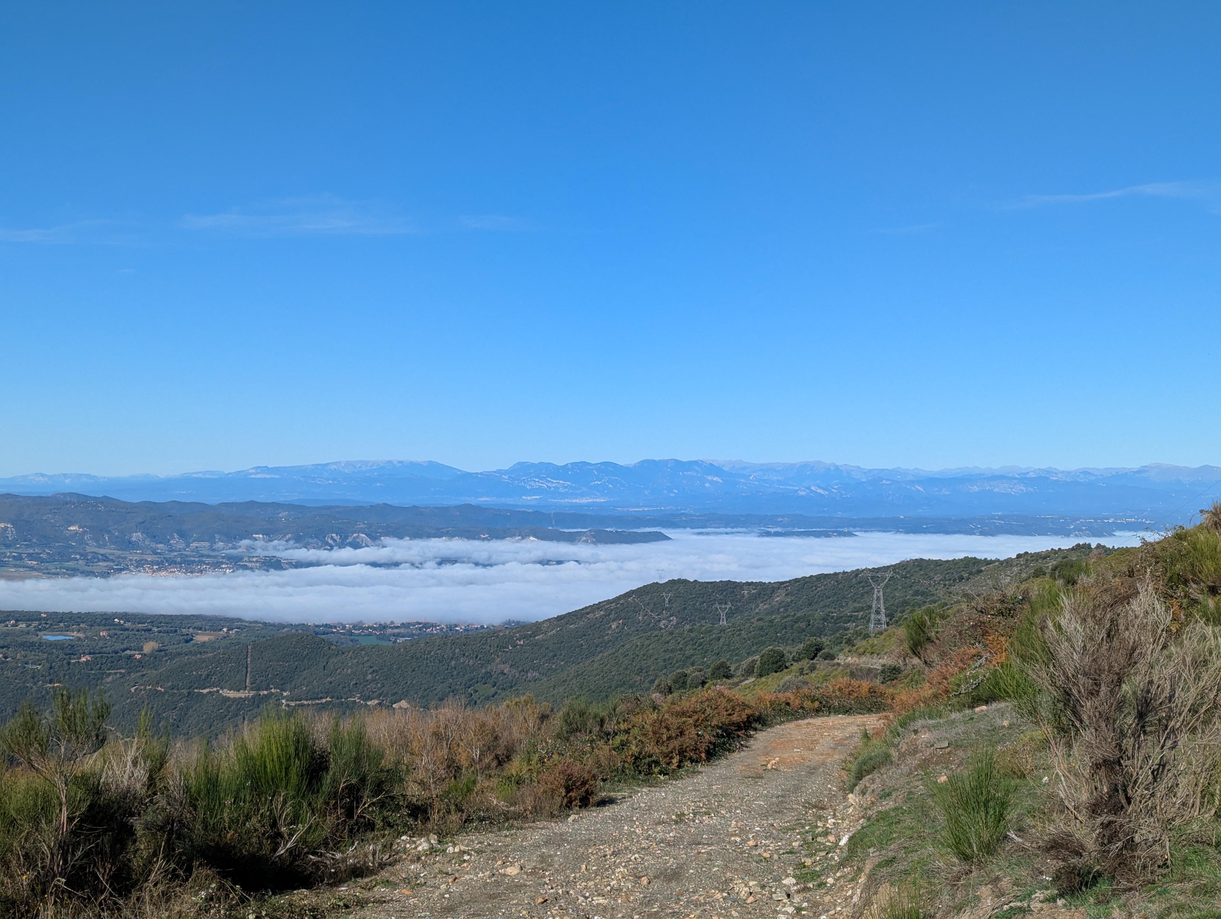Trasa była liniowa “w tę i spowrotem”. Gosia i ja poszliśmy przodem, żeby zdobyć szczyt. Maciek z Kubą szli z tyłu i mieliśmy się spotkać w drodze powrotnej. Od samego startu szlak piął się mocno w górę i intensywnie było przez całą drogę. Da się go podzielić na 3 odcinki: wejście na Turó del Pla de la Barraca (1382 m), Turó Gros (1540 m) i na sam Matagalls (1697 m). Przez większość szlak był odkryty i można było podziwiać widoki. Dosyć ciekawy efekt dawała szybko zmieniająca się perspektywa. Te same kierunki wraz ze wzrostem wysokości zaczynały wyglądać zupełnie inaczej.