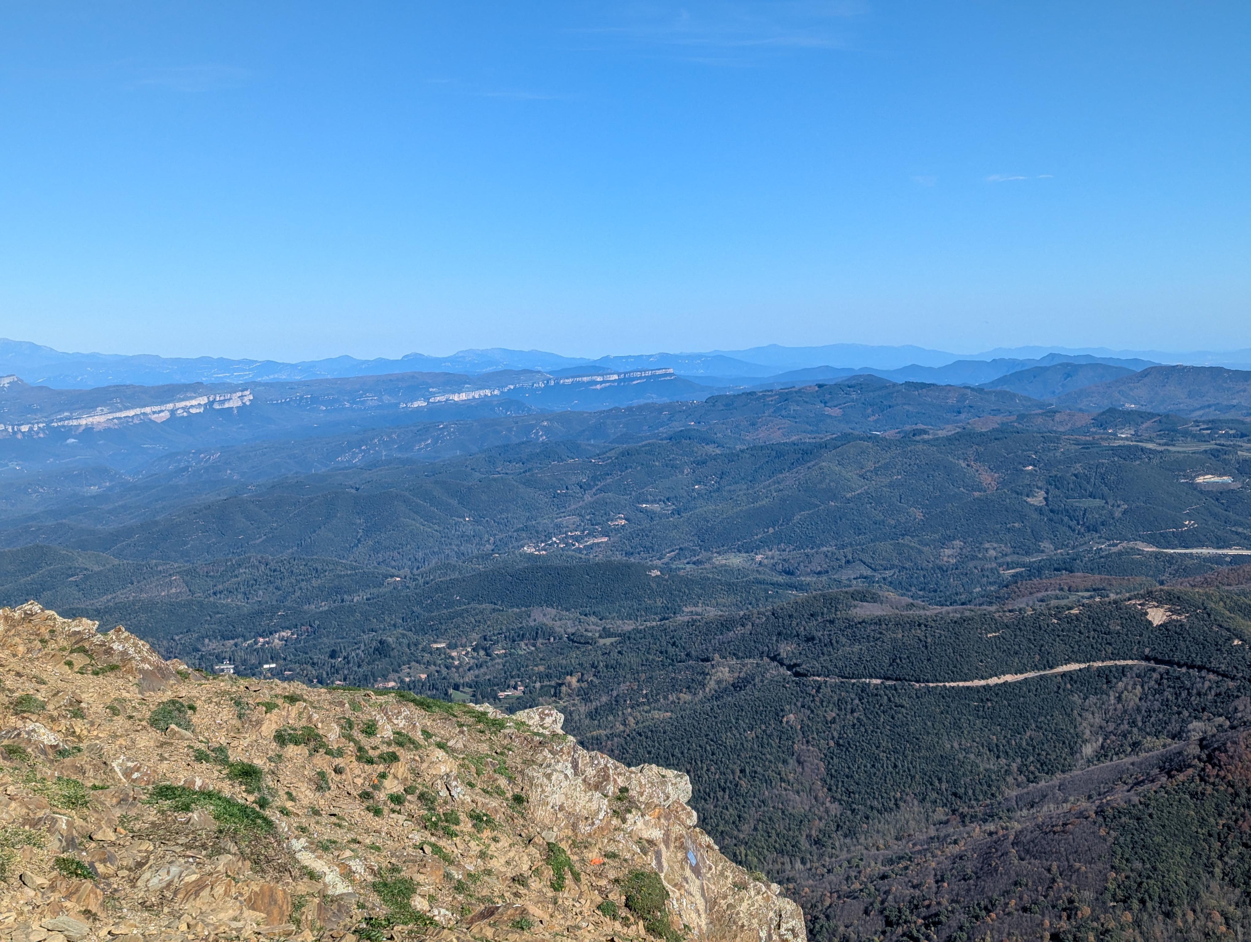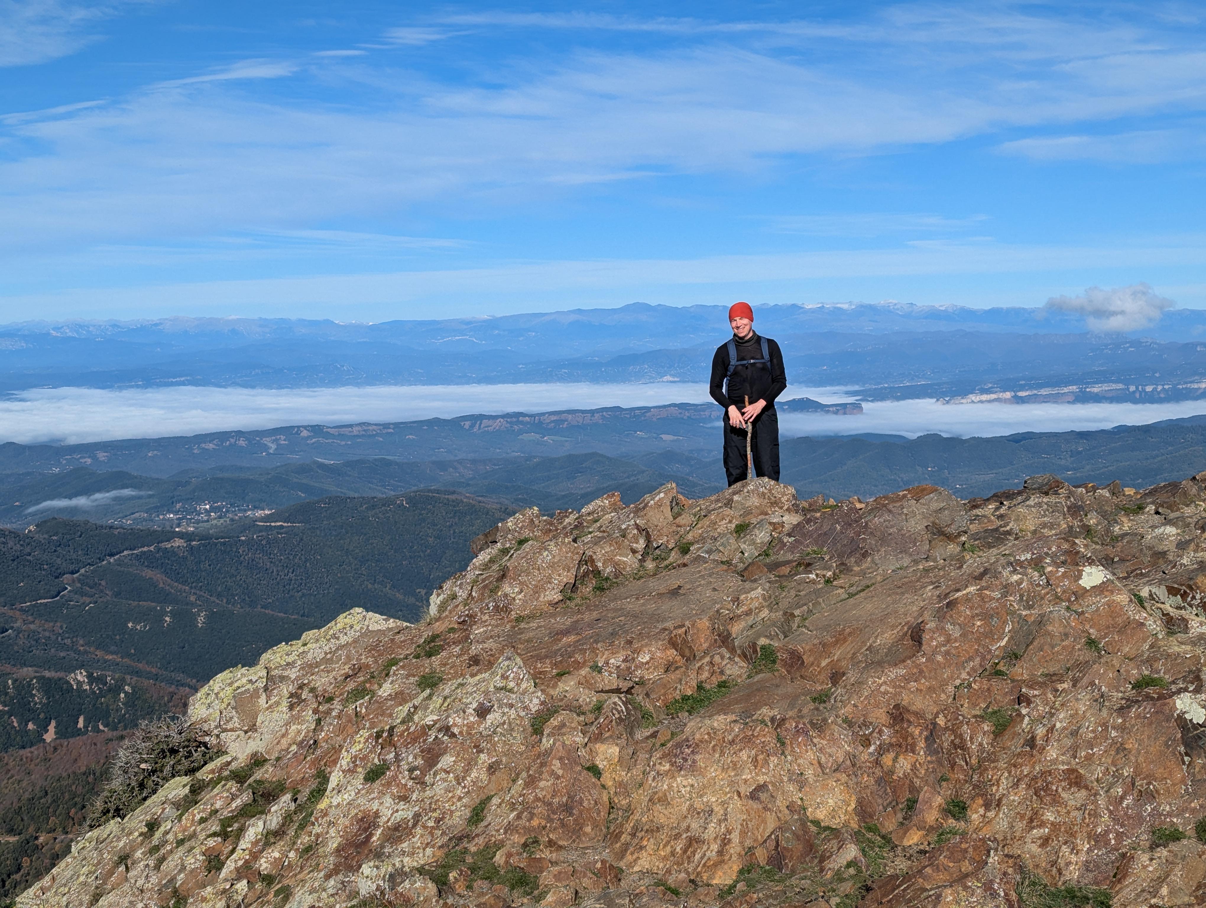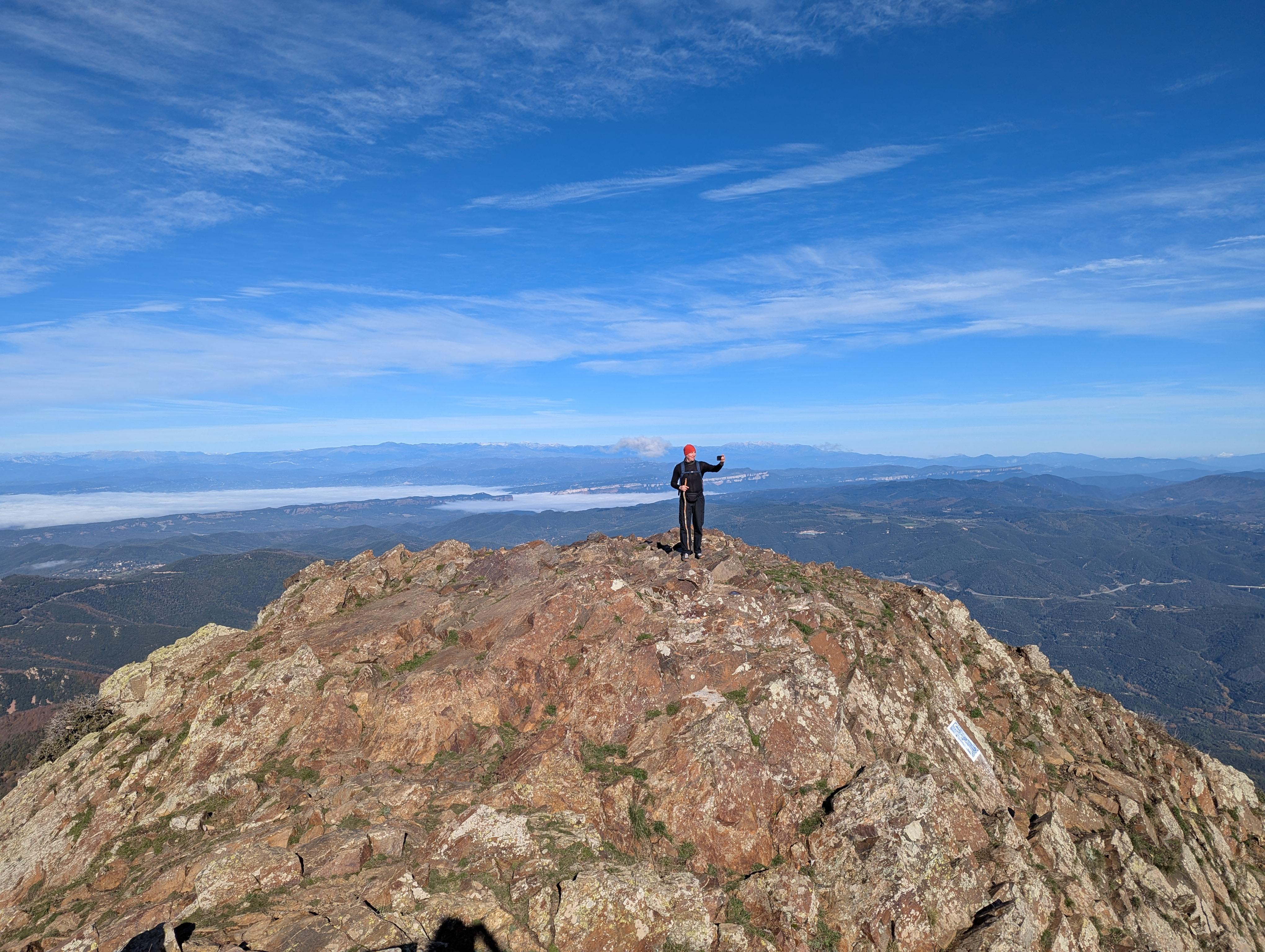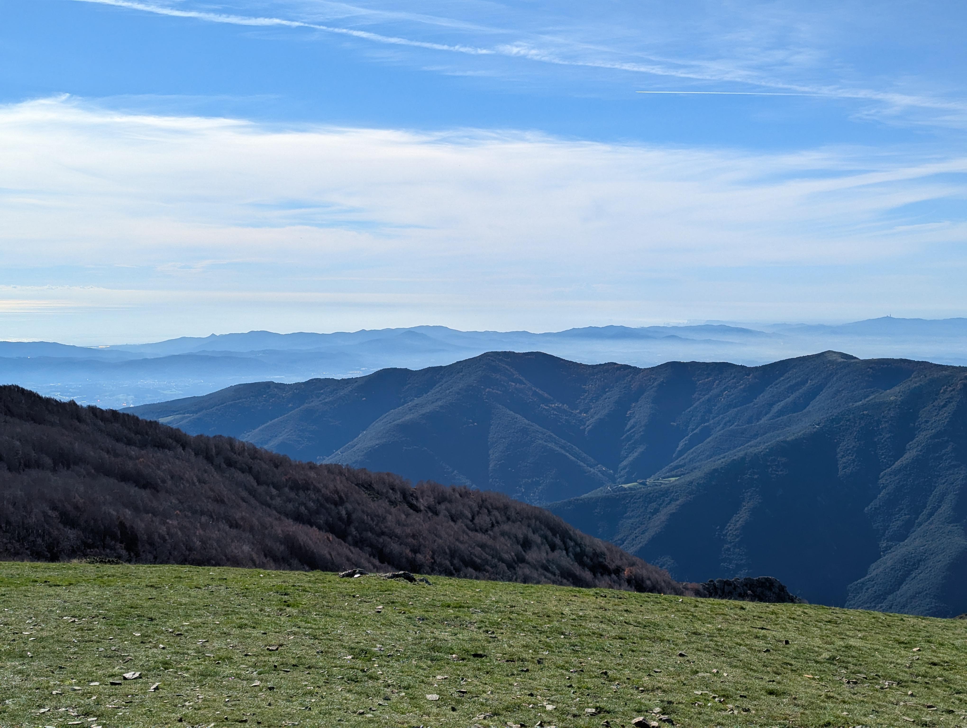 Mimo intensywnego podejścia dosyć szybko osiągneliśmy szczyt Matagalls (1697 m). Miał on budowę kopy — strome choć gładkie podejście i płaski szczyt. Stamtąd rozpościerał się widok na wszystkie strony. Na wschodzie można było podziwiać dwa najwyższe szczyty Montseny: Los Agudes (1705 m) i Turó de l’Home (1705 m). W ogóle widoki z Montseny są bardzo fajne, bo można też zobaczyć inne okoliczne pasma górskie, a także miasta w oddali.