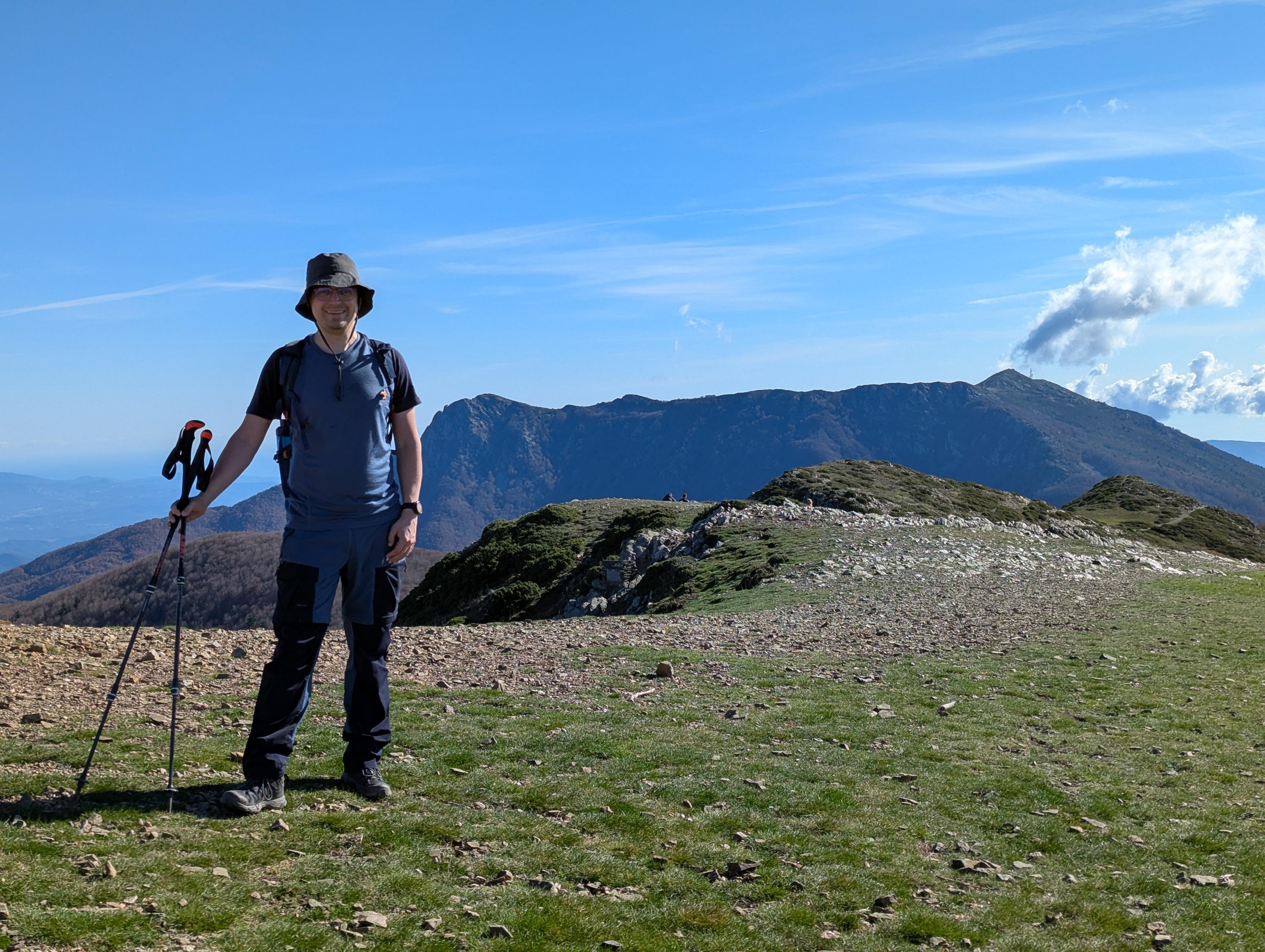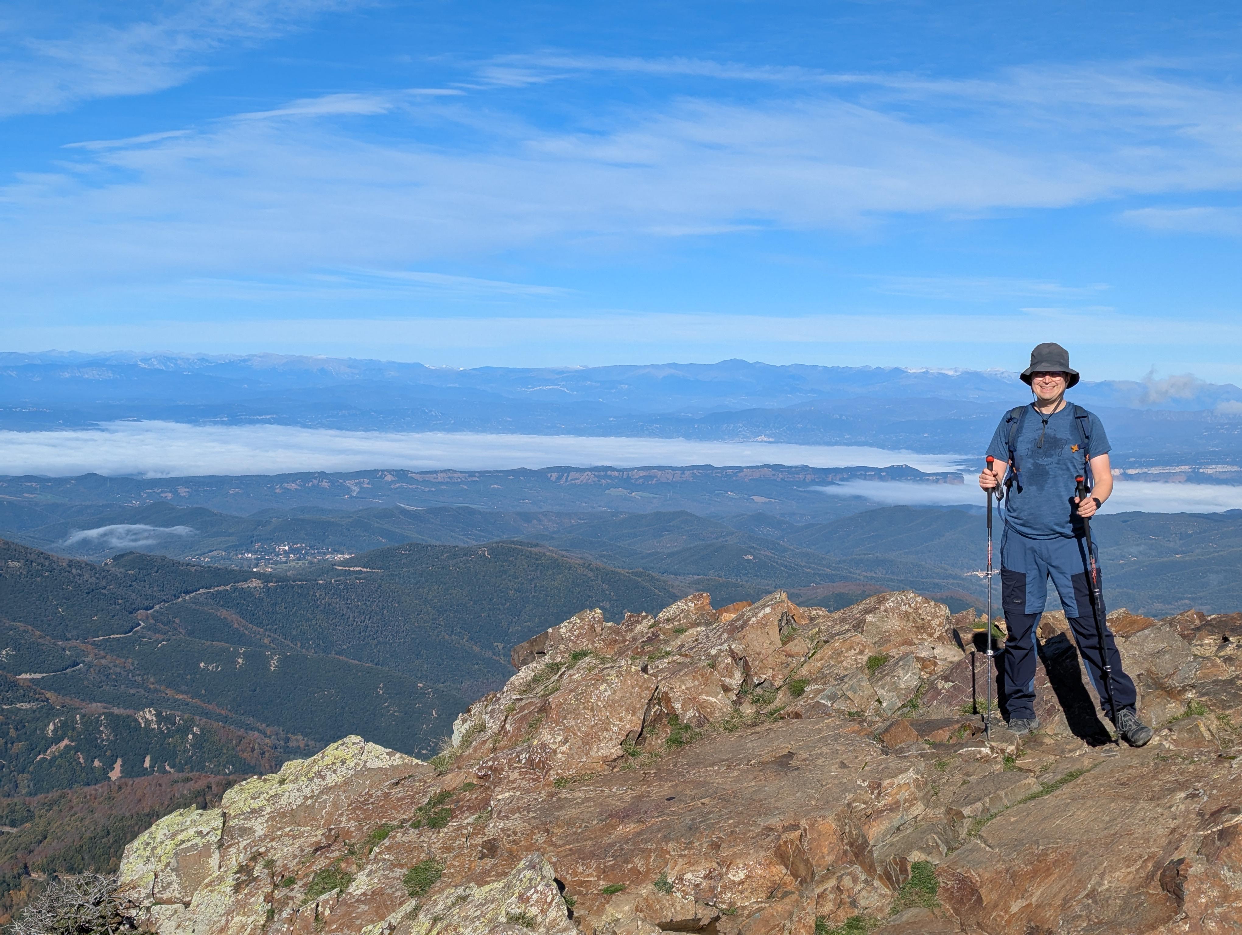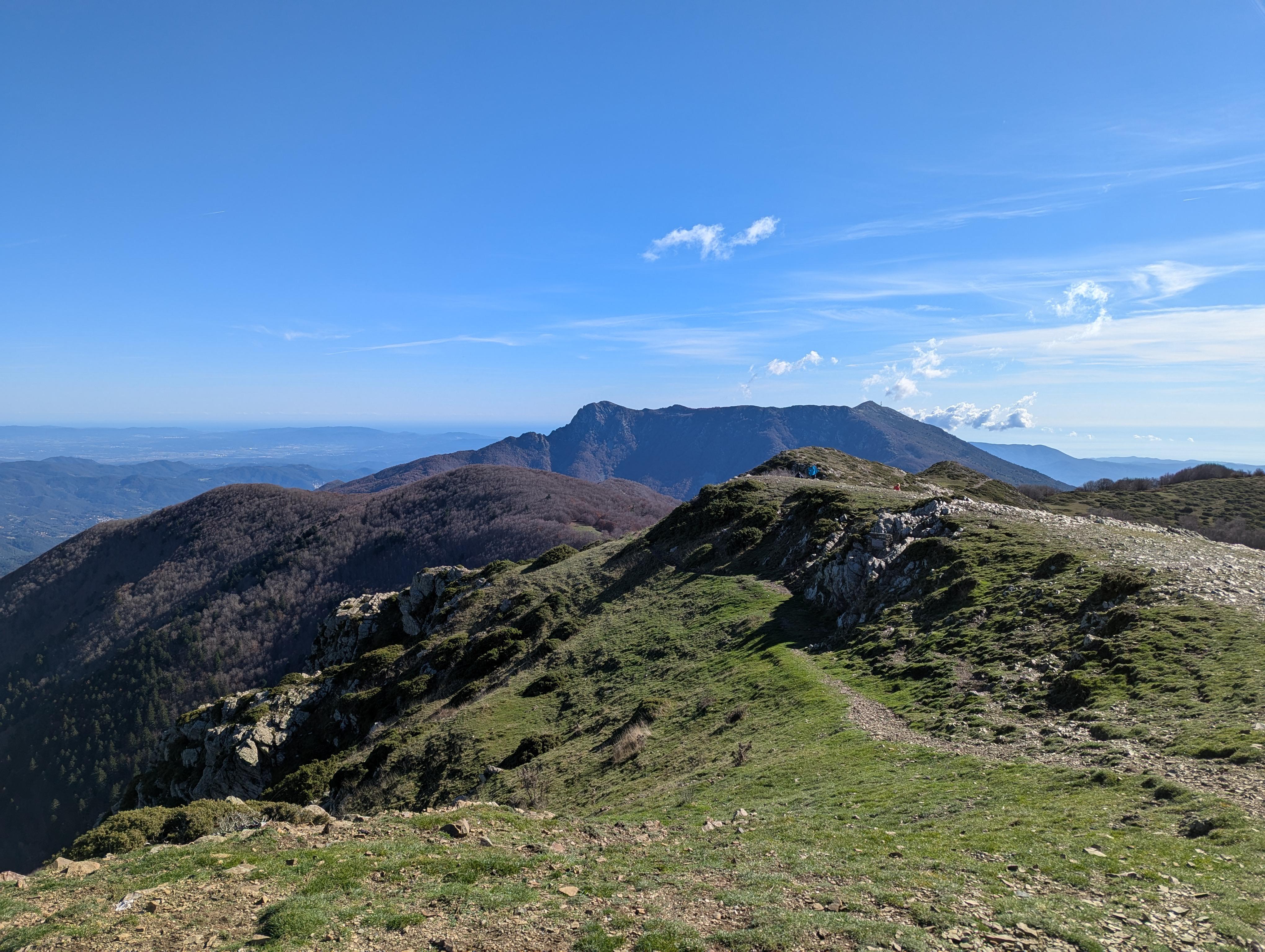 Mimo intensywnego podejścia dosyć szybko osiągneliśmy szczyt Matagalls (1697 m). Miał on budowę kopy — strome choć gładkie podejście i płaski szczyt. Stamtąd rozpościerał się widok na wszystkie strony. Na wschodzie można było podziwiać dwa najwyższe szczyty Montseny: Los Agudes (1705 m) i Turó de l’Home (1705 m). W ogóle widoki z Montseny są bardzo fajne, bo można też zobaczyć inne okoliczne pasma górskie, a także miasta w oddali.