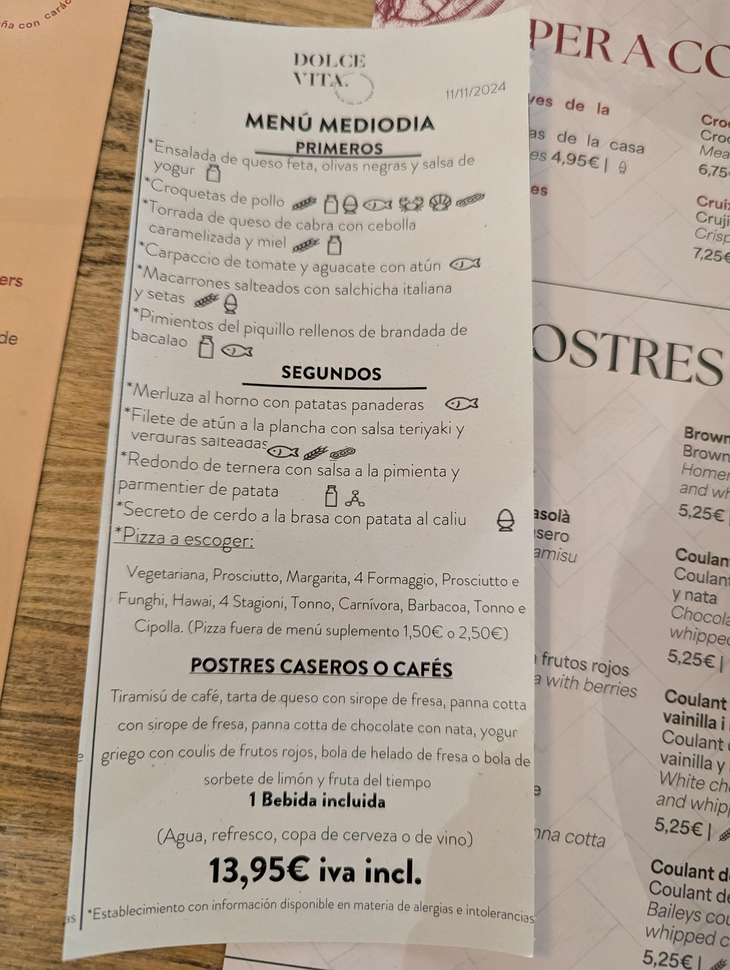 Ale zdarzało nam się też jeść najpopularniejszą formę obiadu, czyli Menú del día (menu dnia) / Menú mediodía (menu lunchowe). Polega to na tym, że płaci się ryczałtowo 14 - 18 euro i dostaje się: