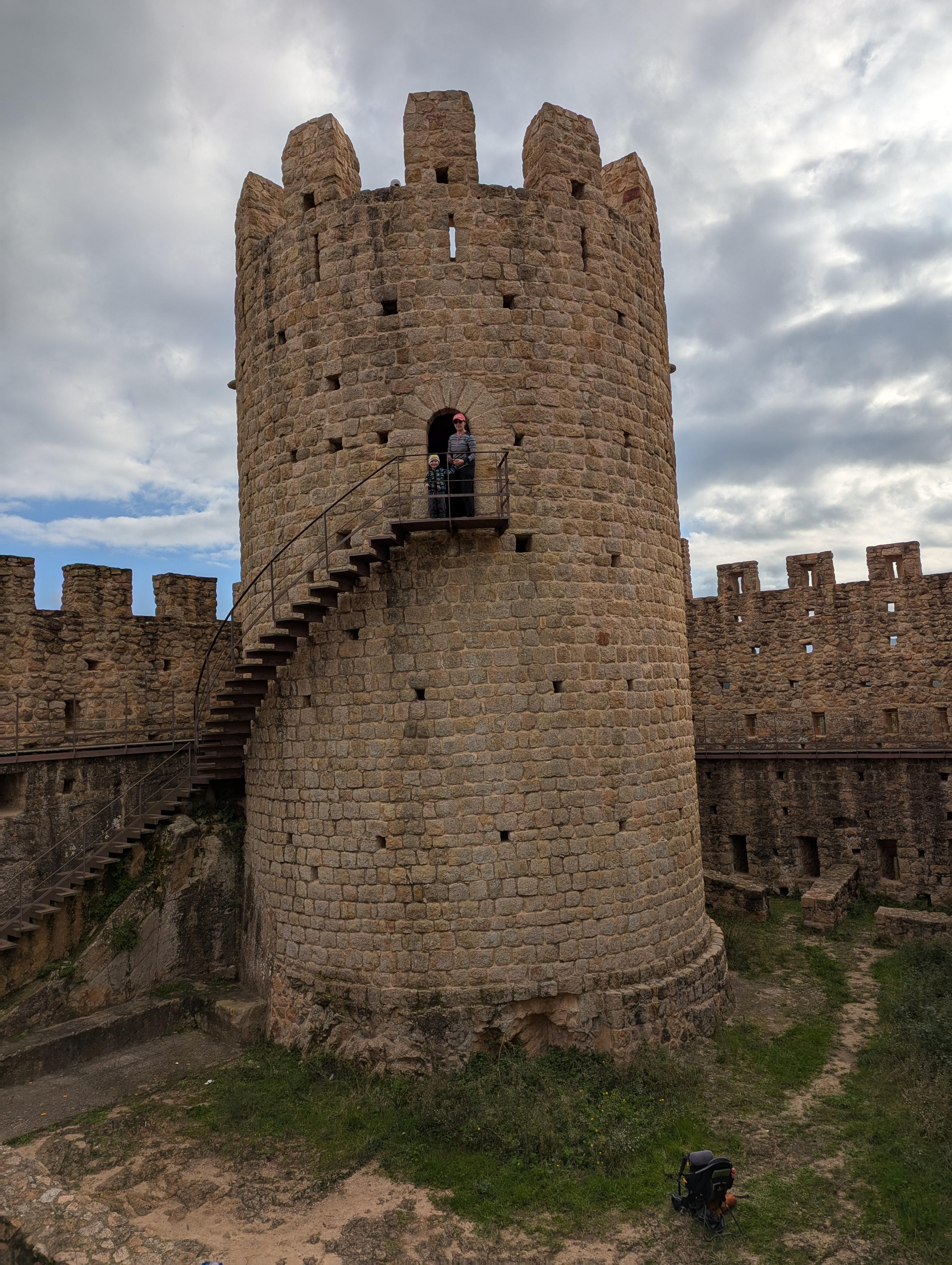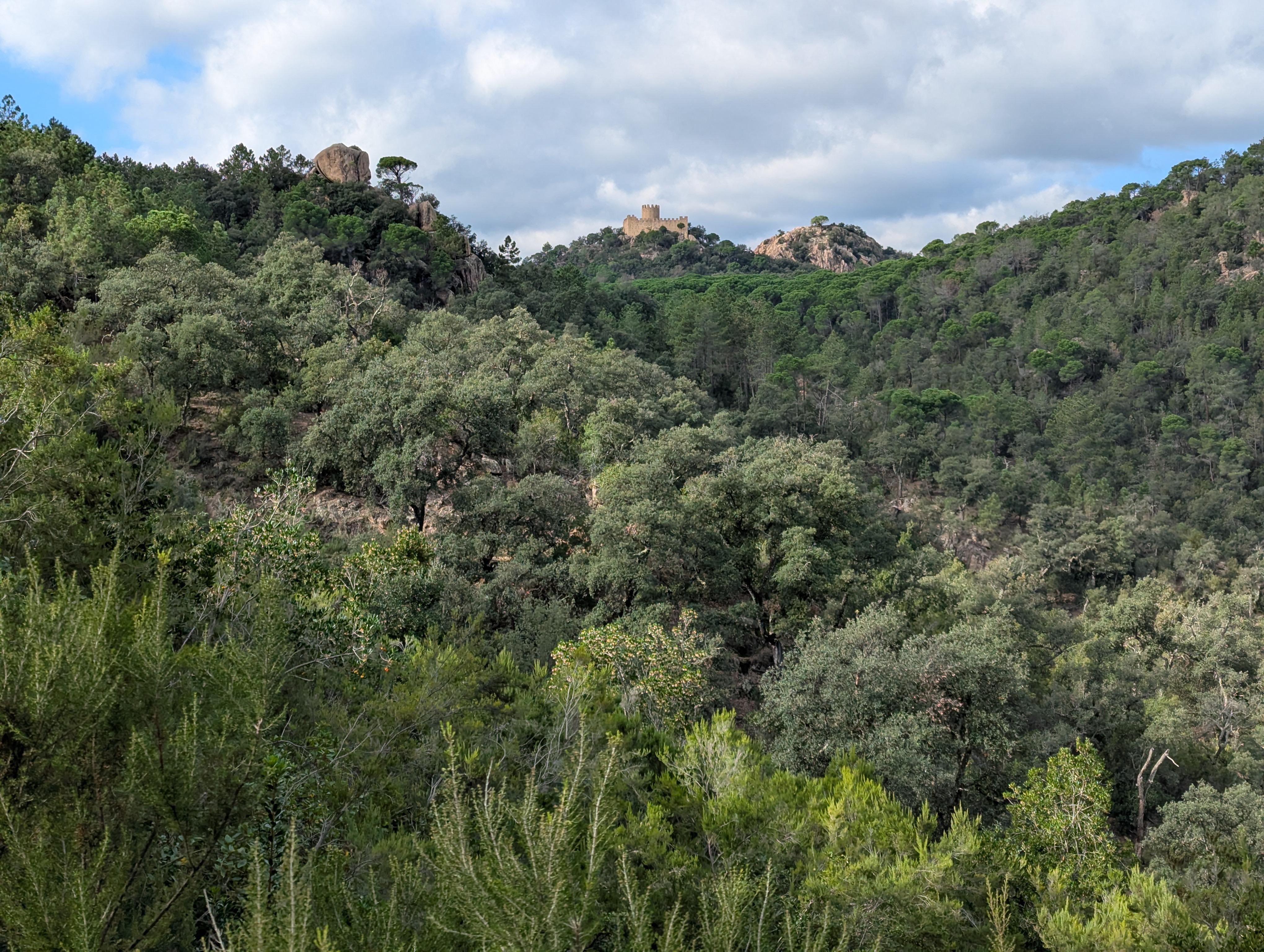 Ostatniego dnia pojechaliśmy na wspólną spokojną wycieczkę do zamku. Dojechaliśmy na drugą stronę gór do Santa Coloma de Farners. W górę szlak był mało-uczęszczany (dużo osób po prostu idzie drogą gruntową, po której można też wjechać samochodem). Wiódł doliną, a później mocno wspinał się na grań. Dalej dołączał do drogi i łagodnie się wznosił do celu. Pod zamkiem były ruiny klasztoru Mare de Déu de Farners, gdzie zatrzymała się potężna wycieczka szkolna. Na szczęście do zamku Castell de Farners (414 m) dotarliśmy sami. Z zamku roztaczał się widok na wszystkie strony, m.in. masyw Montseny, Santa Coloma de Farners, a obok zamku widoczna była skała Turó del Vent (442 m).
